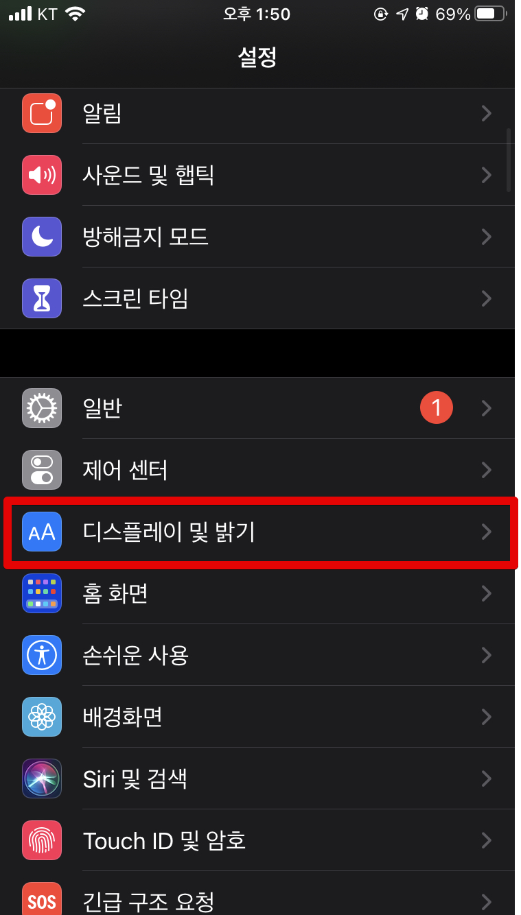 제일 먼저 아이폰에서 설정 - 디스플레이 및 밝기 로 들어갑니다.