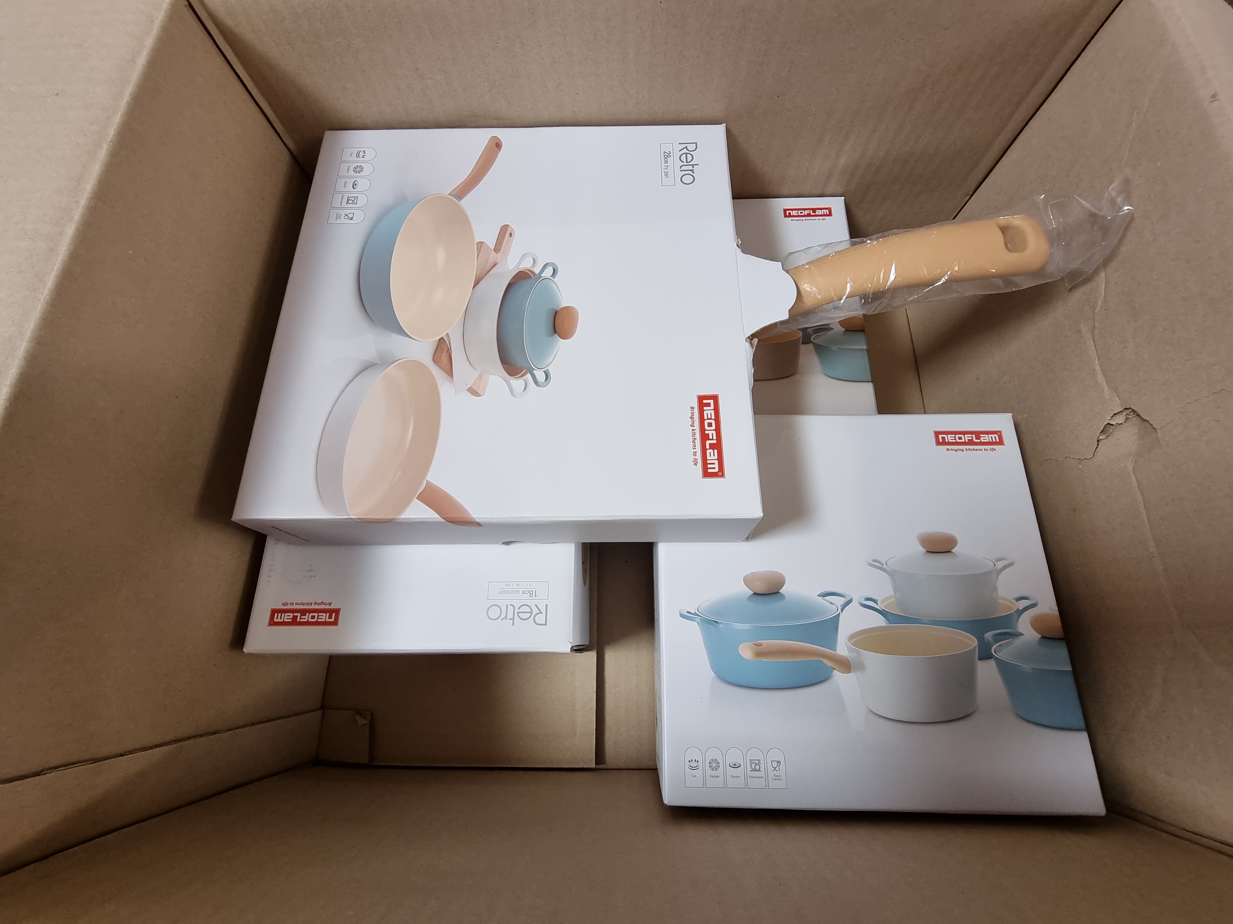 어떤 제품들이 있을까 좀 찾아보다가 아무래도 기능보다는 디자인이 예쁜게 보기에 좋을 것 같아서 네오플램 제품을 찾아보게 되었는데 인덕션 겸용은 아니고 집에는 가스레인지를 쓰기 때문에 일반 제품인 레트로 제품군으로 구매하게 되었다. 냄비 3개와 후라이팬 1개를 샀다.