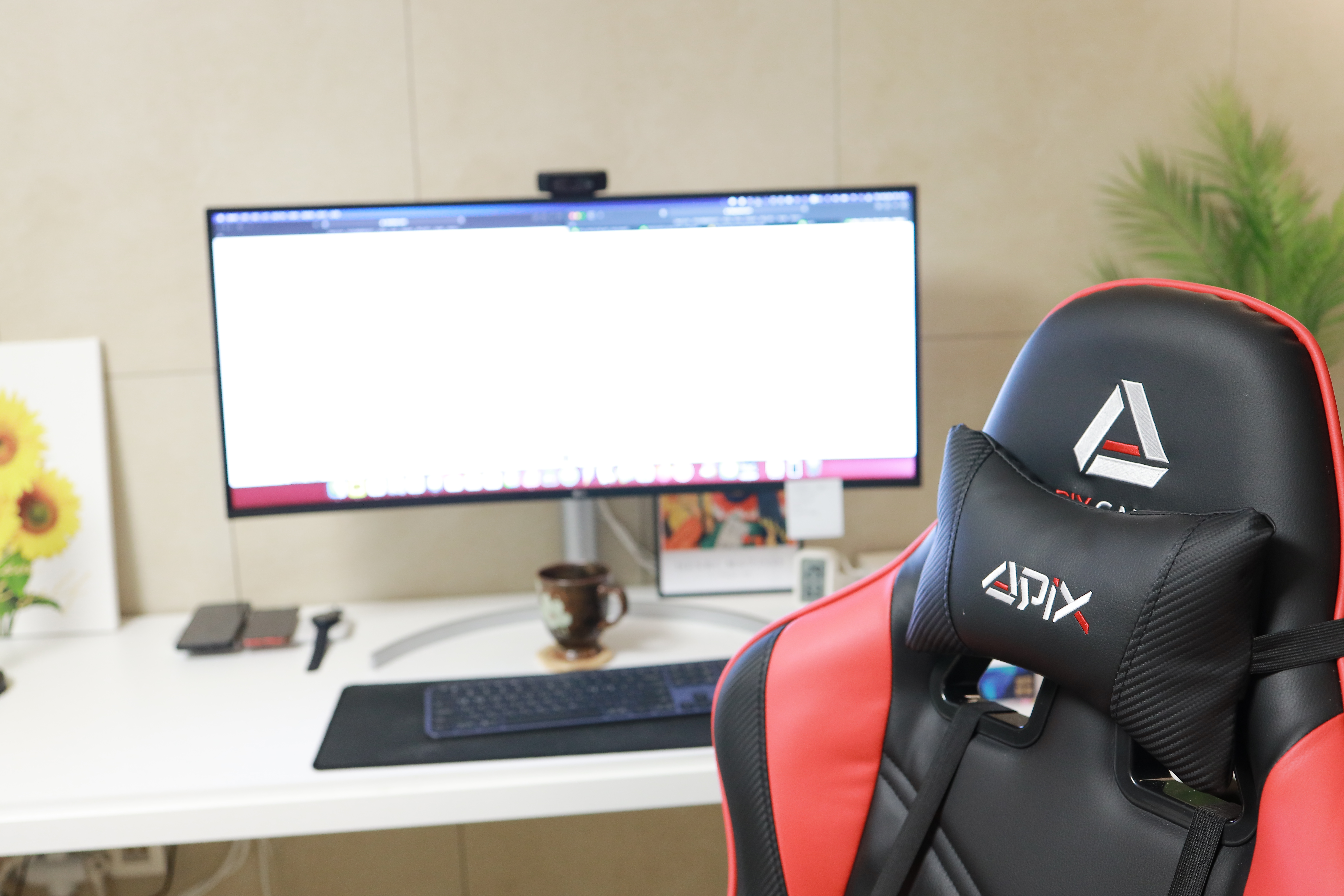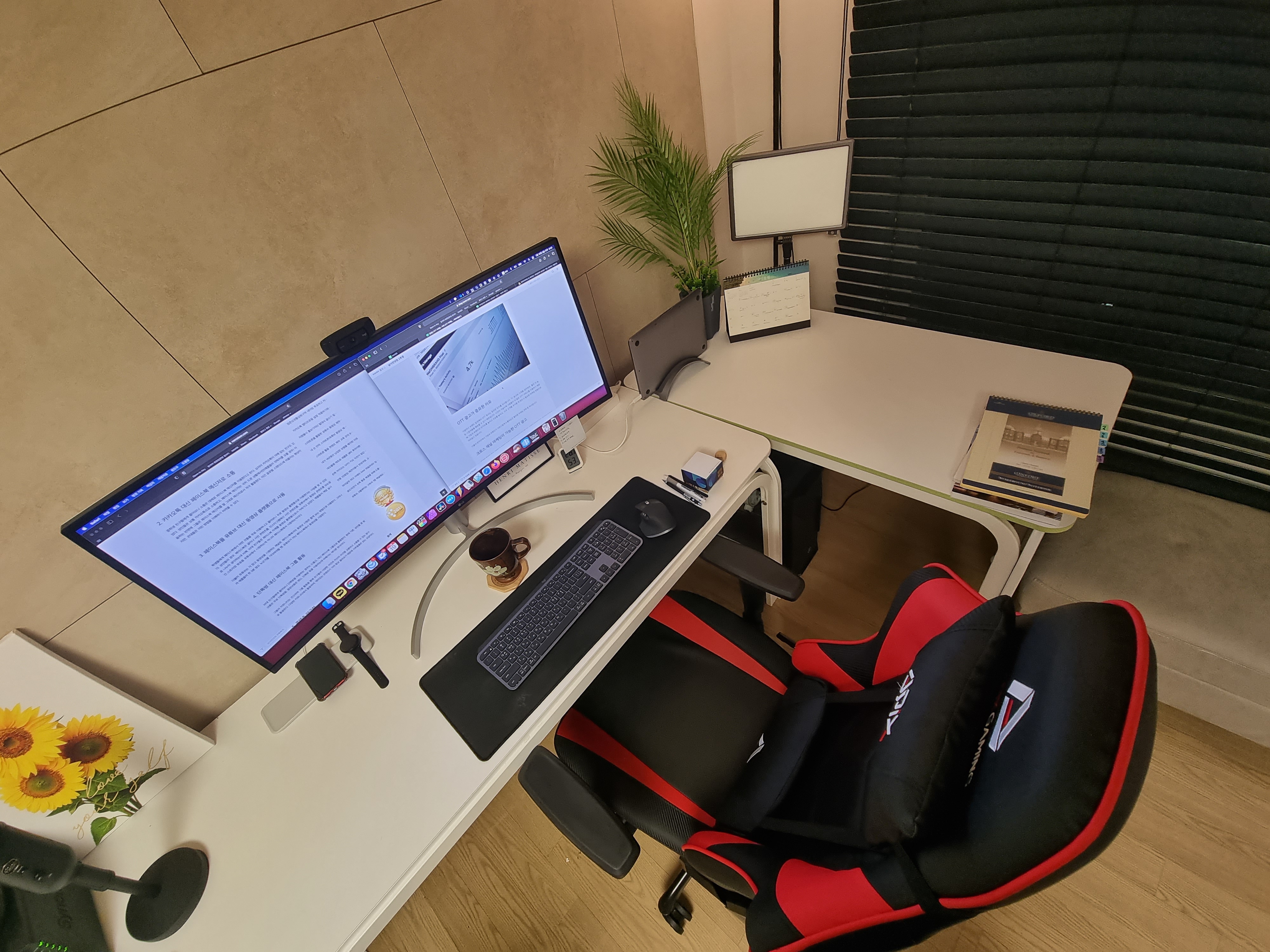 제 눈에는 모니터와 컴퓨터랑도 전체적으로 잘 어울리는 것 같습니다. 의자 디자인도 각진 모양보다는 좀 더 부드러운 곡선 느낌이 많아서 뭔가 IT적인 분위기를 내는 것 같습니다.
