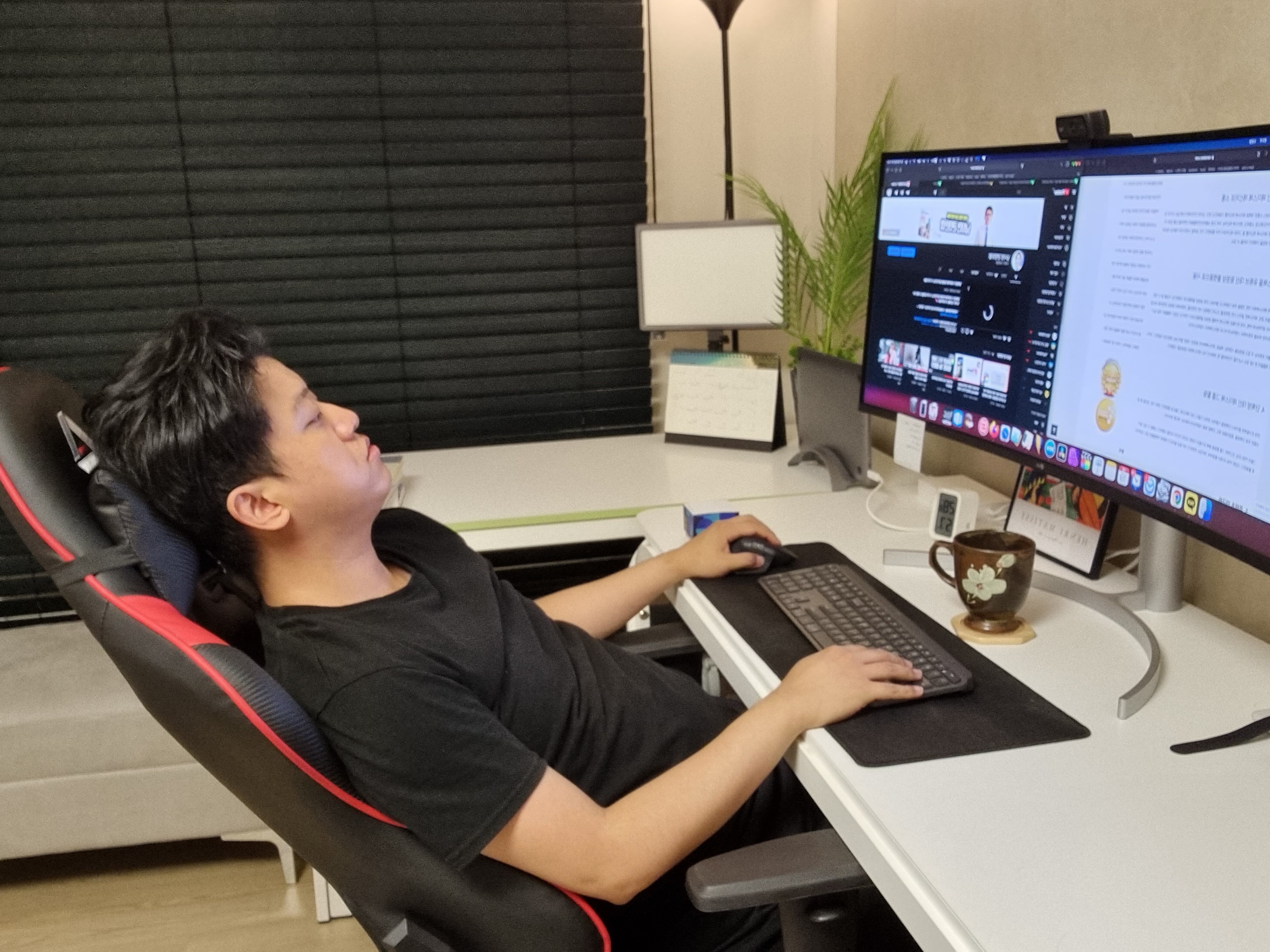 좀 편하게 쉴 때는 의자를 뒤로 젖혀서 이렇게 쉬기도 하고요. 실제로 얼마전에는 이 의자 위에서 잠깐 잠든적도 있었어요.