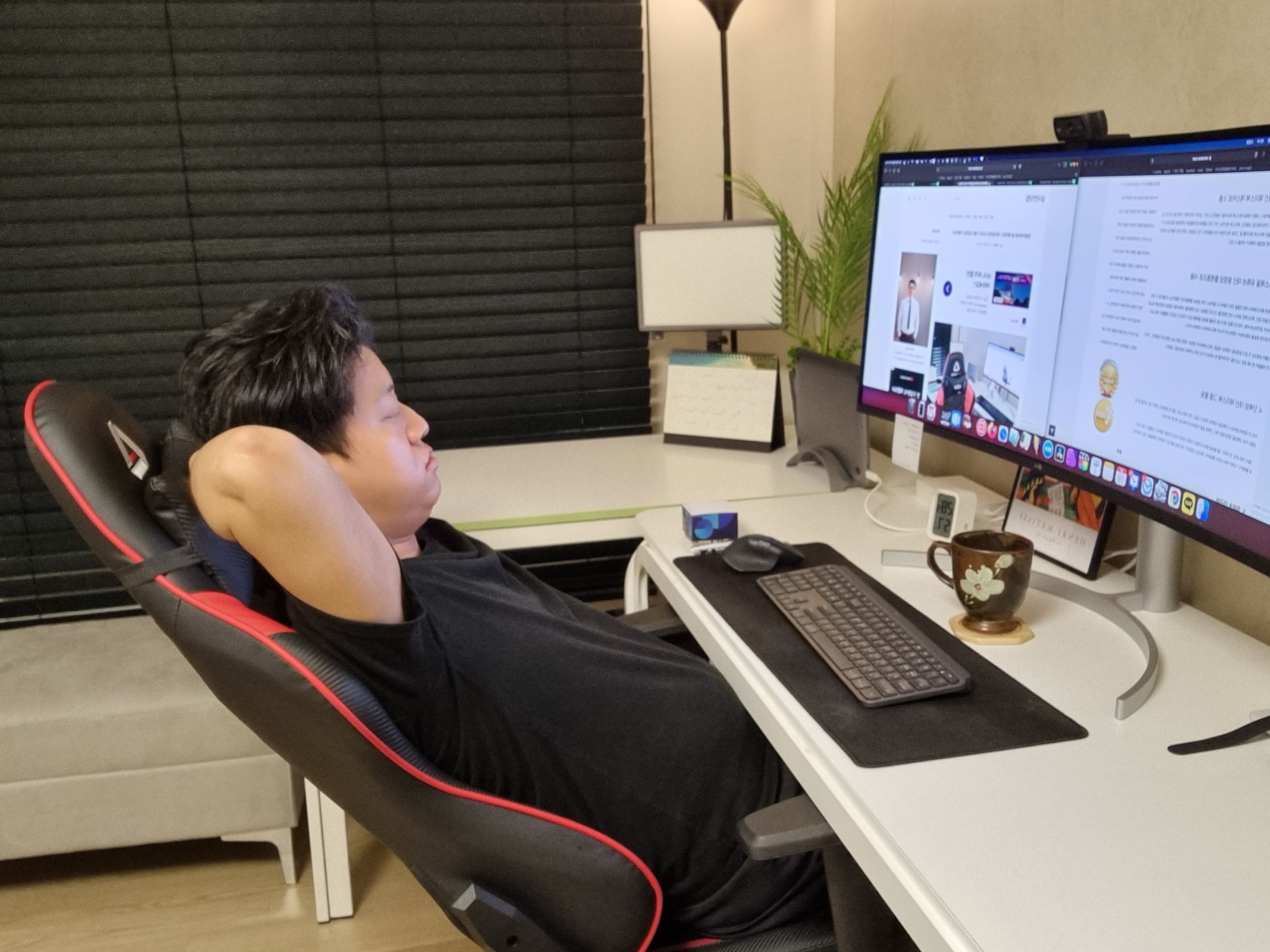 유튜브 영상을 시청하거나 편하게 컴퓨터 하고 싶을 땐 의자를 더 뒤로 젖혀서 몸을 푹 집어넣고 있는게 좋더라고요.