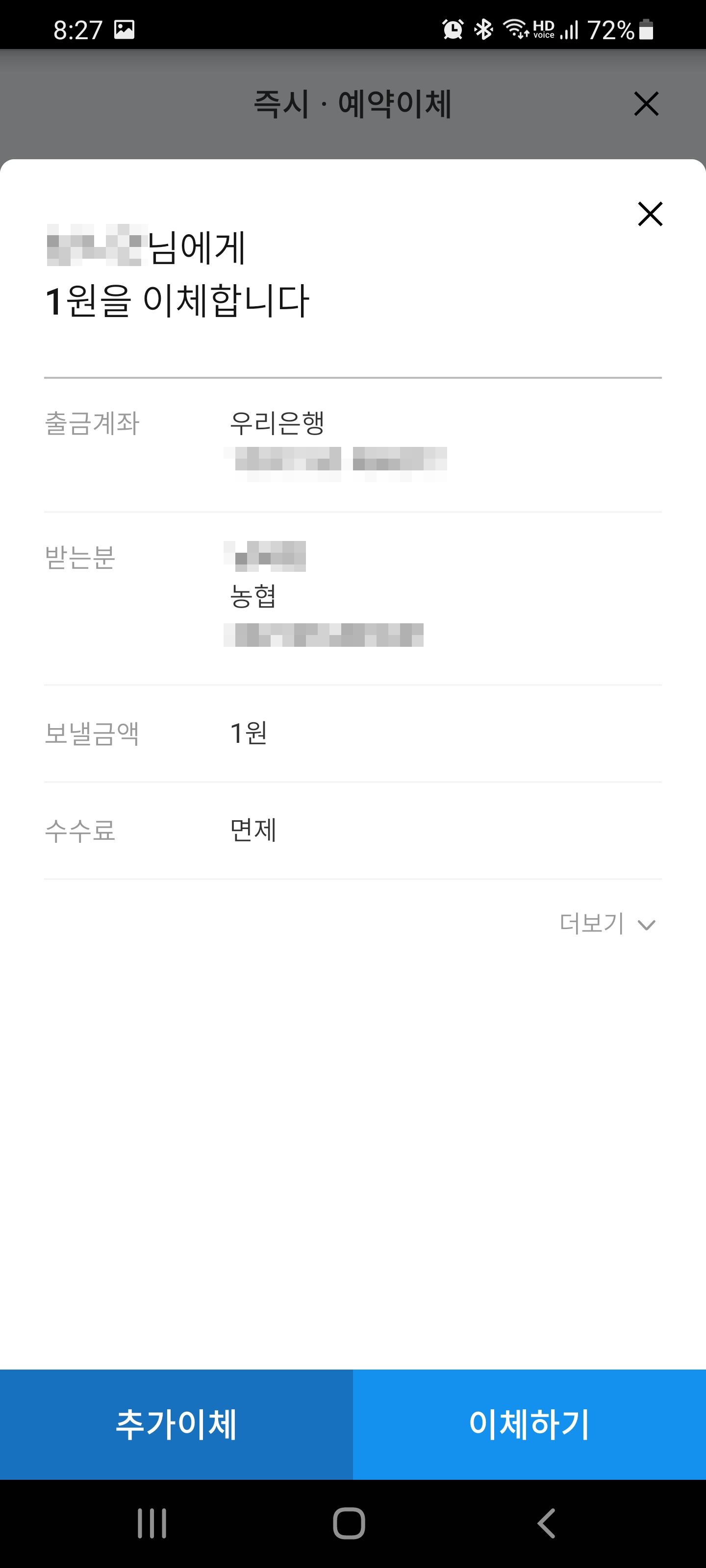 다시 테스트를 위해 이번에는 우리은행에서 농협으로 이체를 해보았습니다. 알림이 잘 오네요.