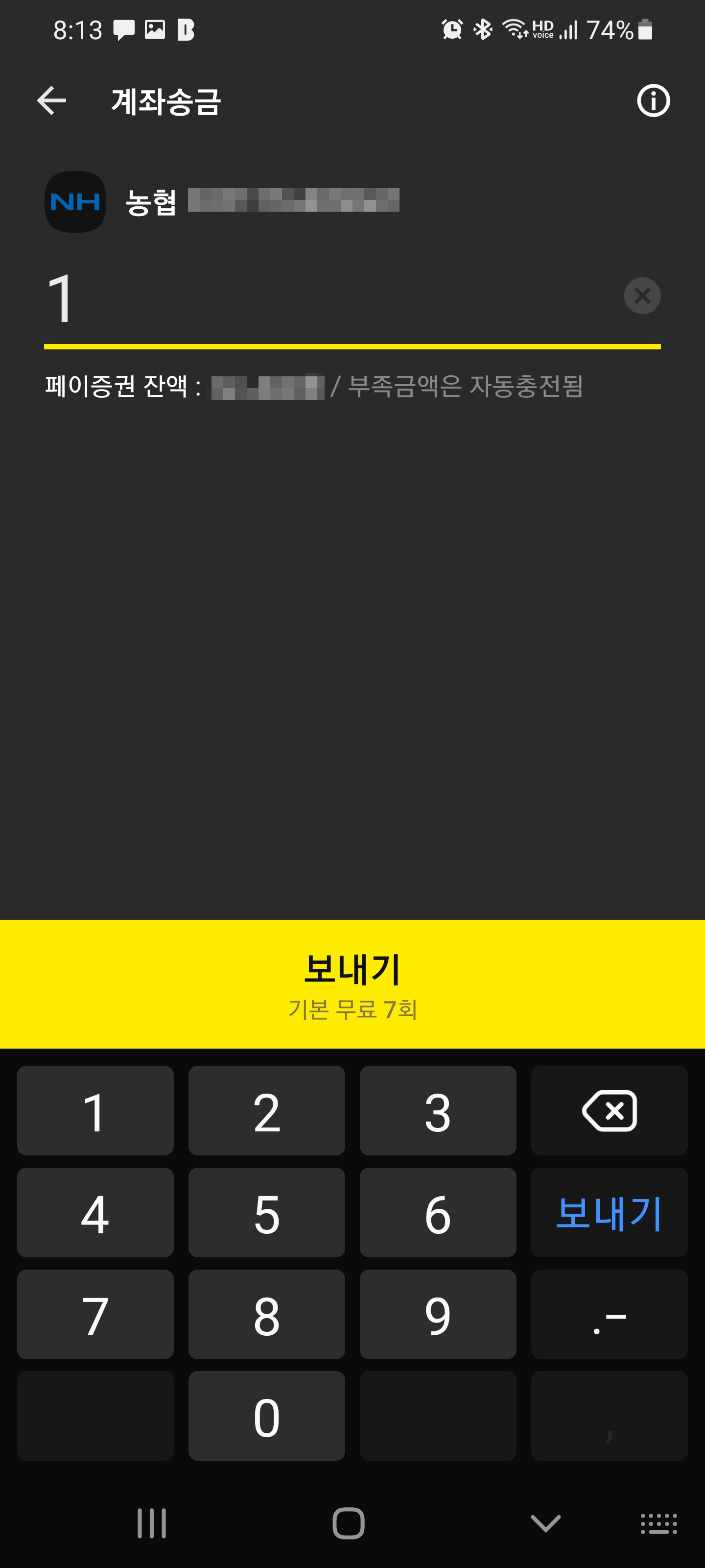 신청 후 테스트로 1원을 입금해보니 확실히 푸시가 잘 옵니다. 기존에는 NH스마트뱅킹에서 푸시가 왔다면, 이제는 NH뱅킹 앱에서 푸시가 오는 형태입니다. 그런데 여기서 한가지 문제가 발생하는데...