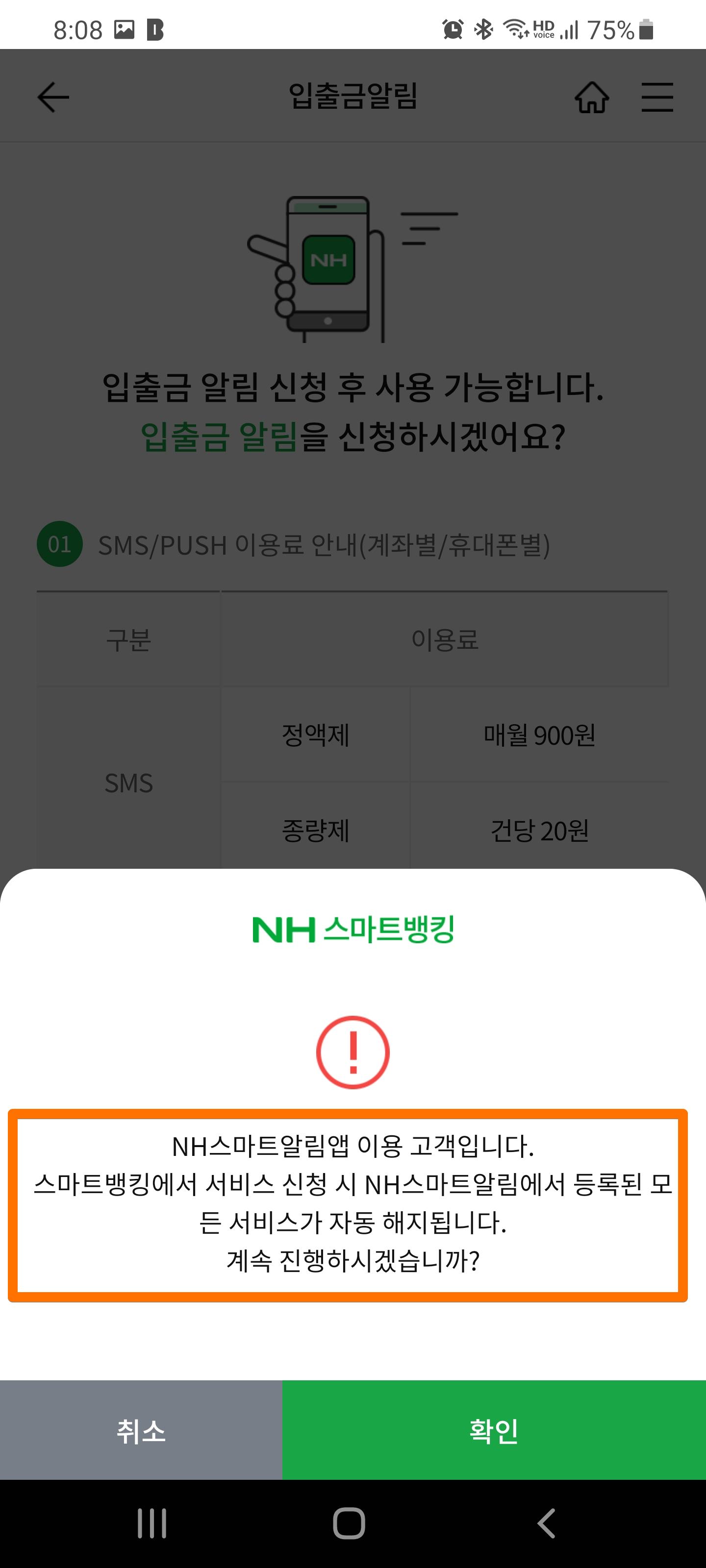 그랬더니 NH스마트알림 이용 고객은 사용할 수 없다고 나오고, NH스마트알림의 서비스를 모두 해지해야만 신청이 가능하다고해서 일단 해지한 후 신청해봤습니다.