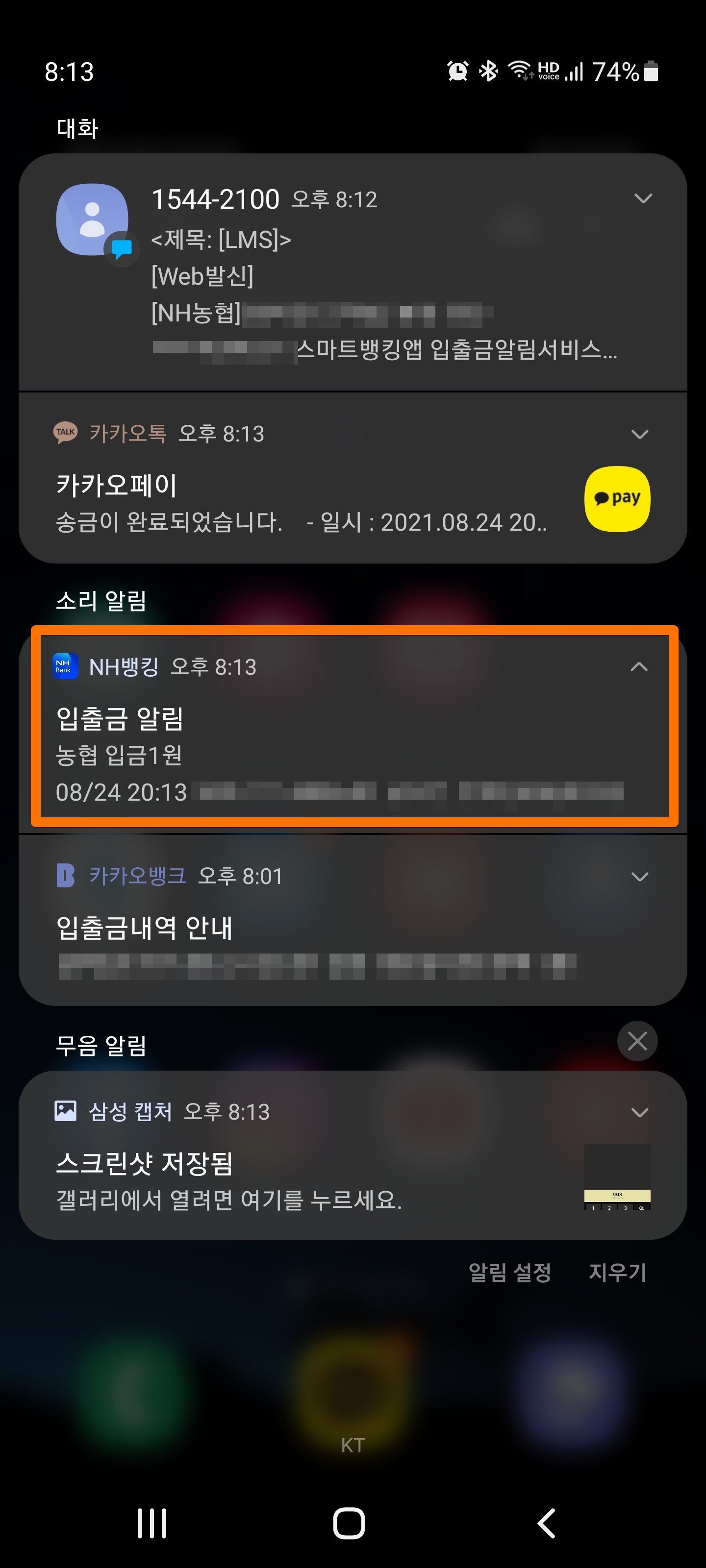 이번에 카카오뱅크에서 계좌를 하나 개설했는데 개설하는 과정에서 1원을 입금해주고 인증받는 절차가 있는데 NH농협 계좌로 받았으나 알림이 오지 않아 앱에 들어가서 로그인 한 다음에야 알림이 오지 않는다는걸 알아챘습니다. 분명 처음에 설치하고나서는 테스트했을 때 작동했었거든요. 그런데 며칠 지나니 작동하지 않는것입니다.