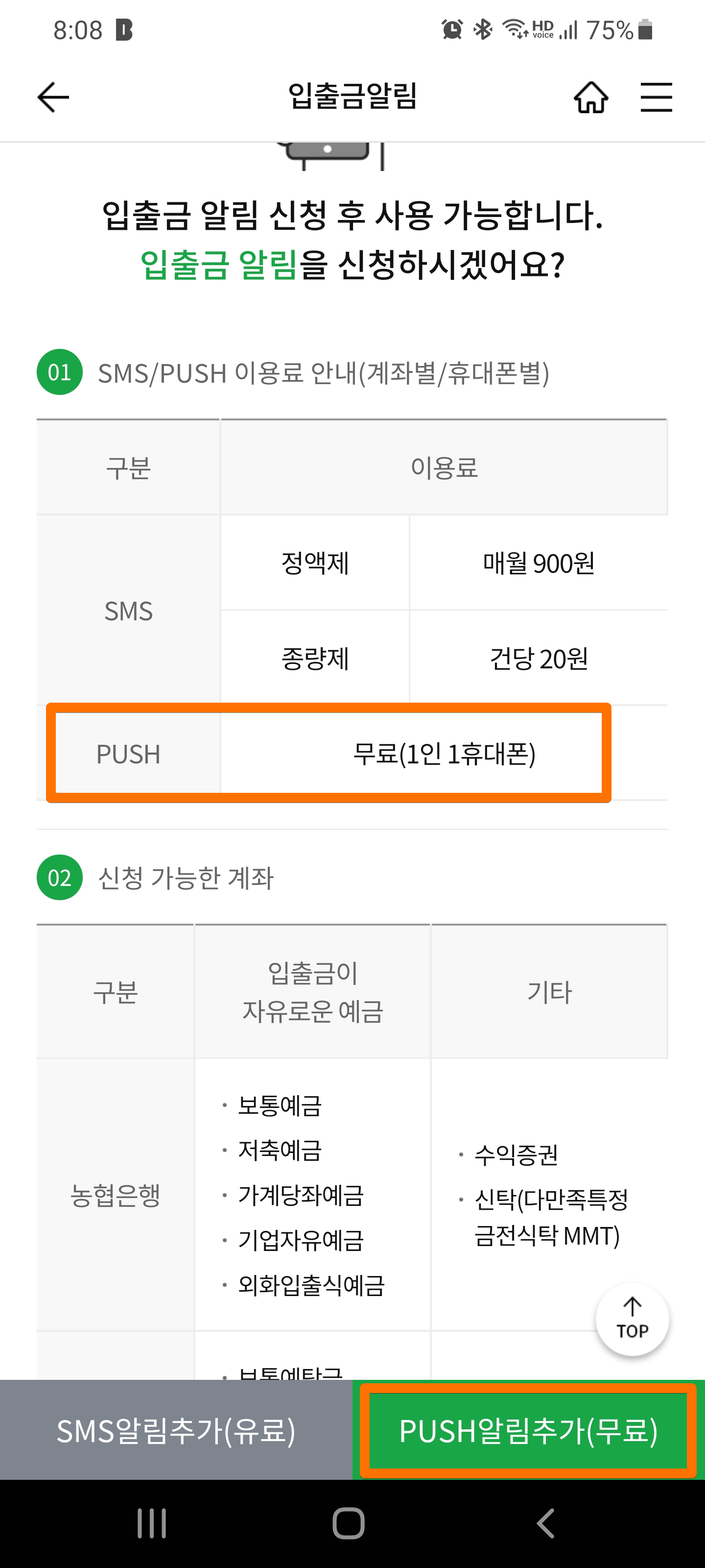 방법을 찾아보고자 무작정 NH뱅킹 앱에 들어가서 알림이 있는지 찾아봤습니다. 그랬더니 기존에 쓰던 SMS 외에도 앱에서 푸시를 해주는 기능이 1인 1휴대폰에 한정으로 무료로 제공되더라고요. 그래서 일단 시청을 해봤습니다.