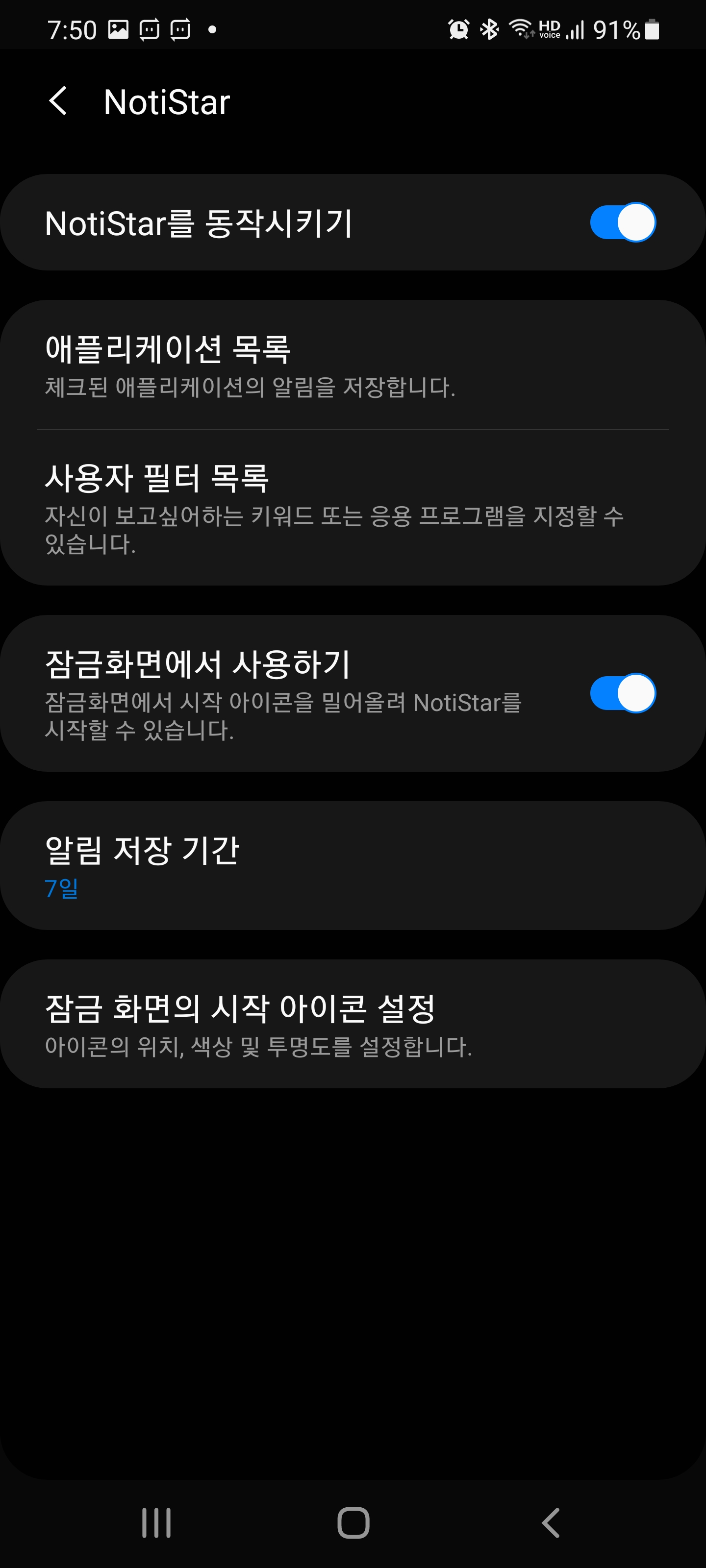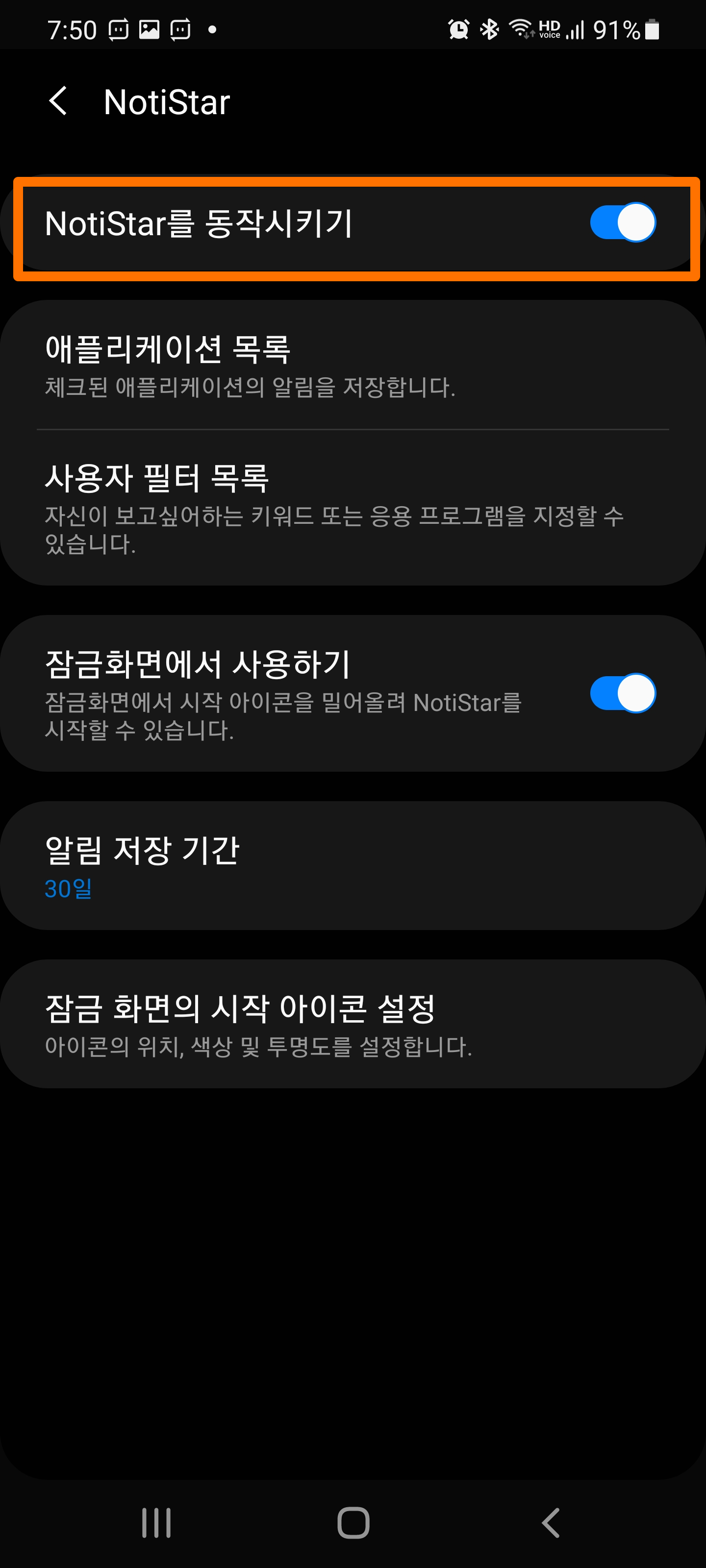 알림 저장 기간도 정해줍니다. 계속 누적으로 저장되기 때문에 주기적으로 지우기 해주어야 합니다. 아래쪽에 '잠금 화면의 시작 아이콘 설정'을 클릭하면 잠금화면에서 알림을 확인할 버튼의 위치와 색상 투명도 등을 조절할 수 있습니다.