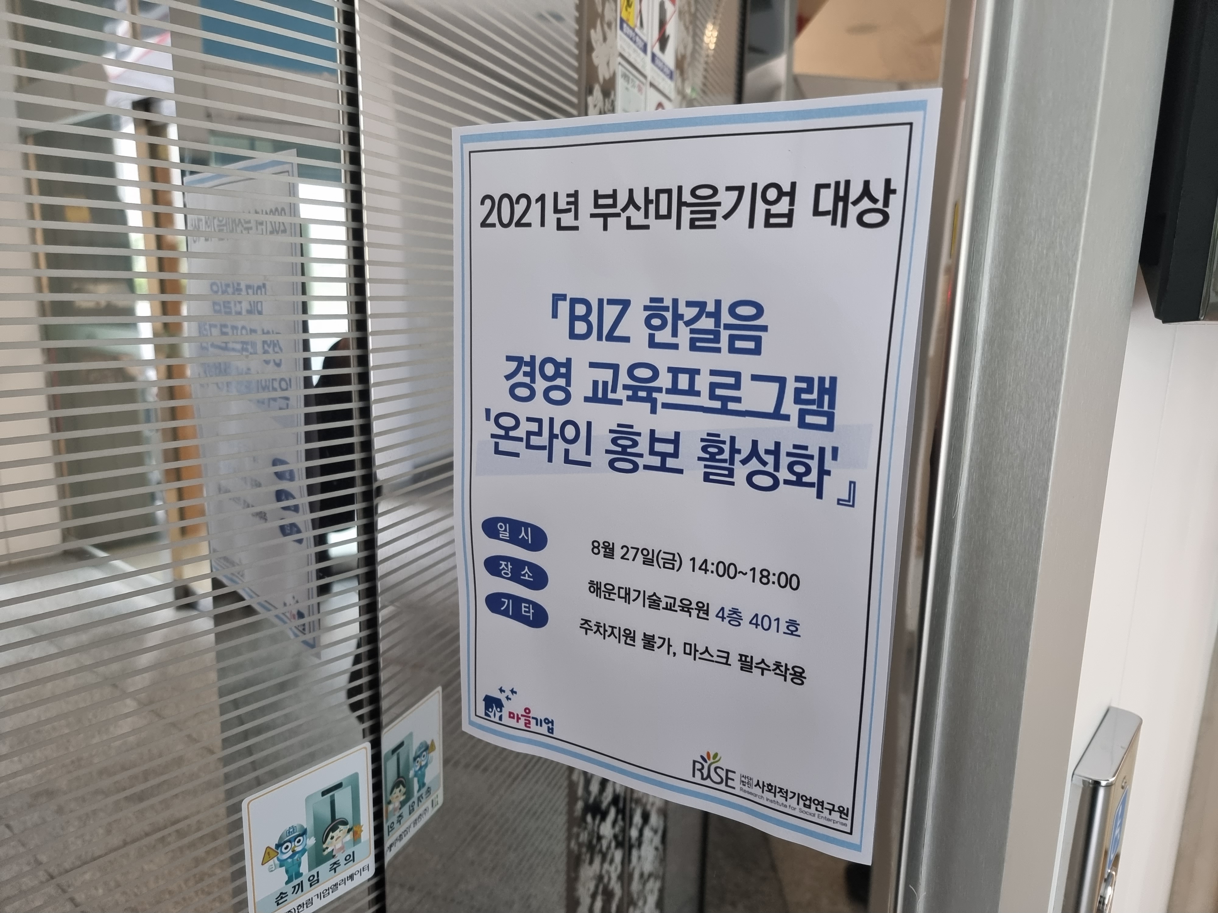 사회적기업연구원에서 2021년 부산 마을기업 대상 온라인 홍보 활성화 교육에 특강 강사로 초청해주셔서 다녀왔습니다. 교육은 해운대기술교육원에서 진행되었습니다.