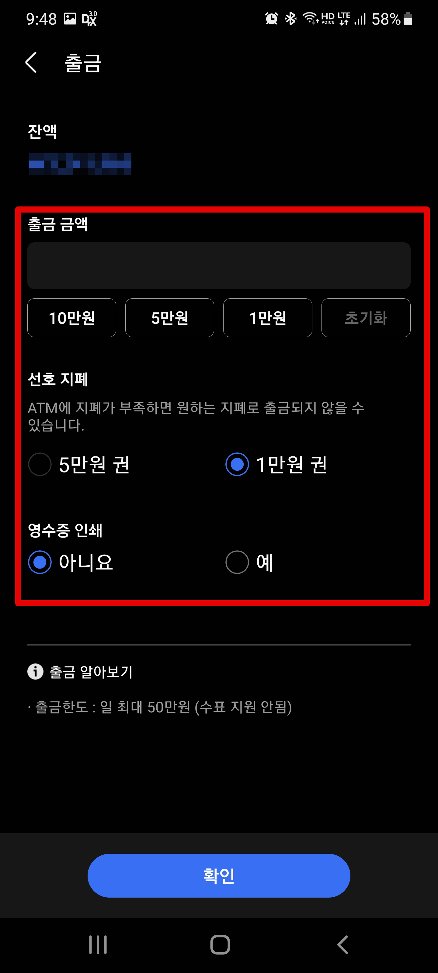 이제 해당 계좌 아래에 있는 출금 버튼을 클릭한 후 출금금액과 5만원권, 1만원권을 체크해주세요. 더불어 영수증 안쇄 여부도 선택해줍니다.