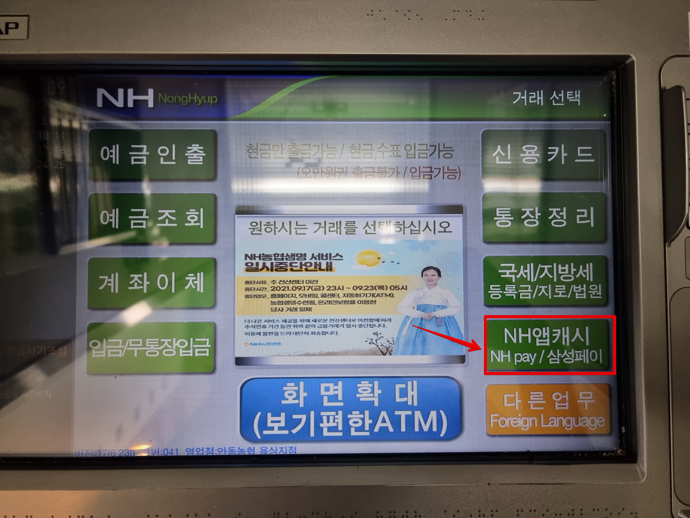 이제 농협 ATM 기계에서 메뉴를 찾아야하는데요. NH앱캐시(NH pay / 삼성페이)라고 된 메뉴를 찾으세요.