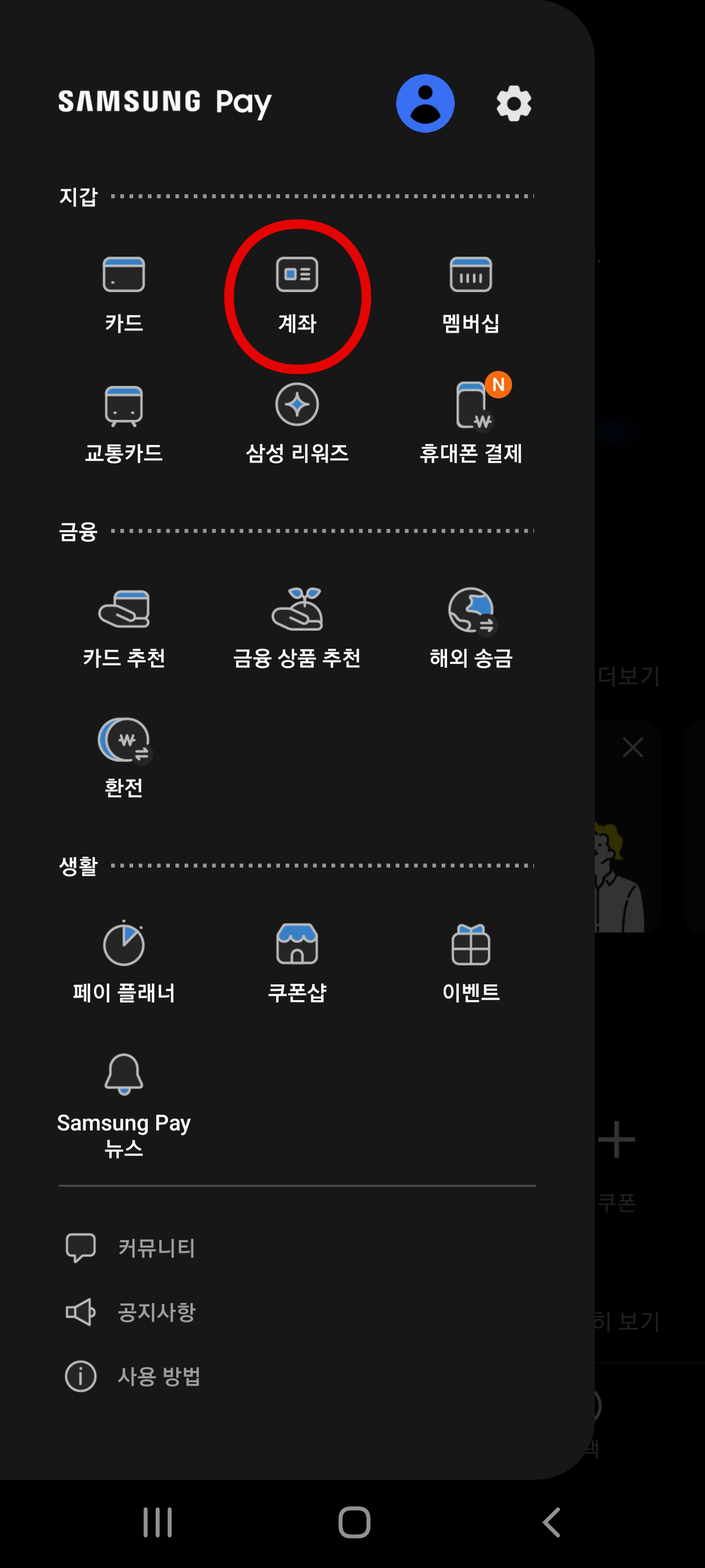 일단 삼성페이에서 좌측 상단에 있는 메뉴를 누르시고, 계좌를 클릭해서 계좌를 등록합니다. ATM 앞이나 은행 입구에서 이 작업을 해도 괜찮습니다. 금방 끝나거든요.