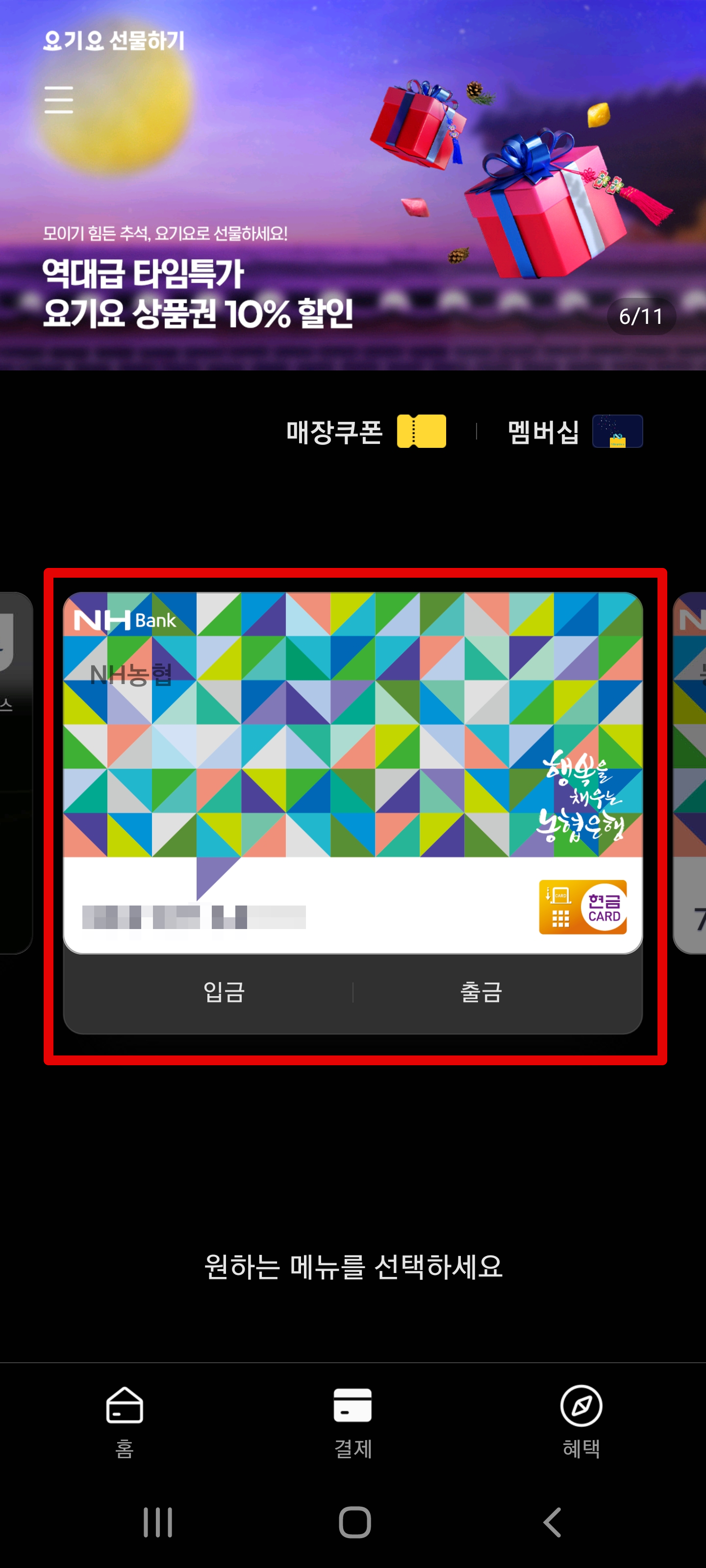 그런 다음 메뉴가 나타나면 스마트폰의 뒷면을 빨간색 칸 위로 갖다대면 바로 인식되면서 현금이 출금됩니다.