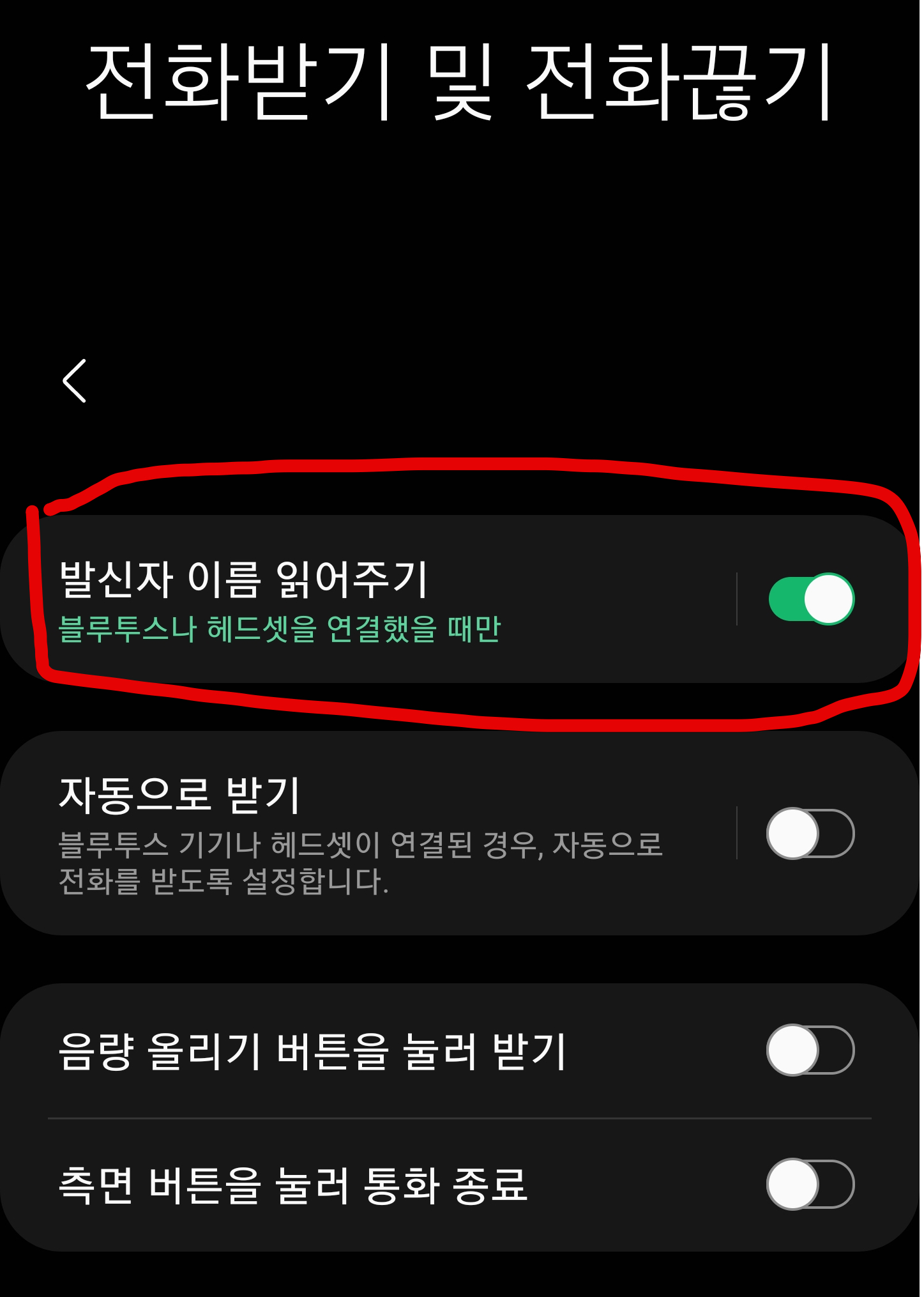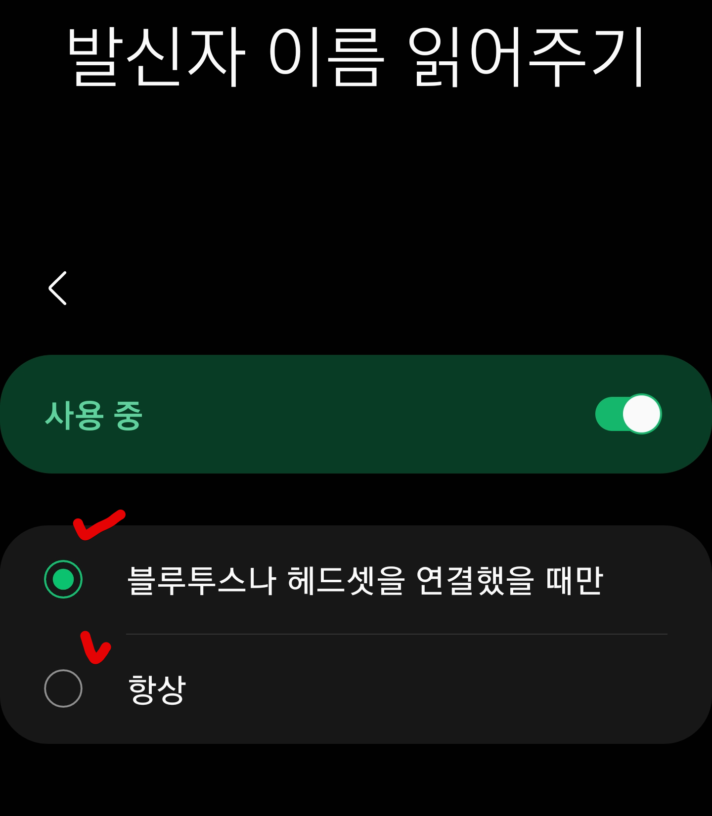 위에보면 발신자 이름으로 읽어주기 기능이 활성화 되어 있는걸 알 수 있습니다.