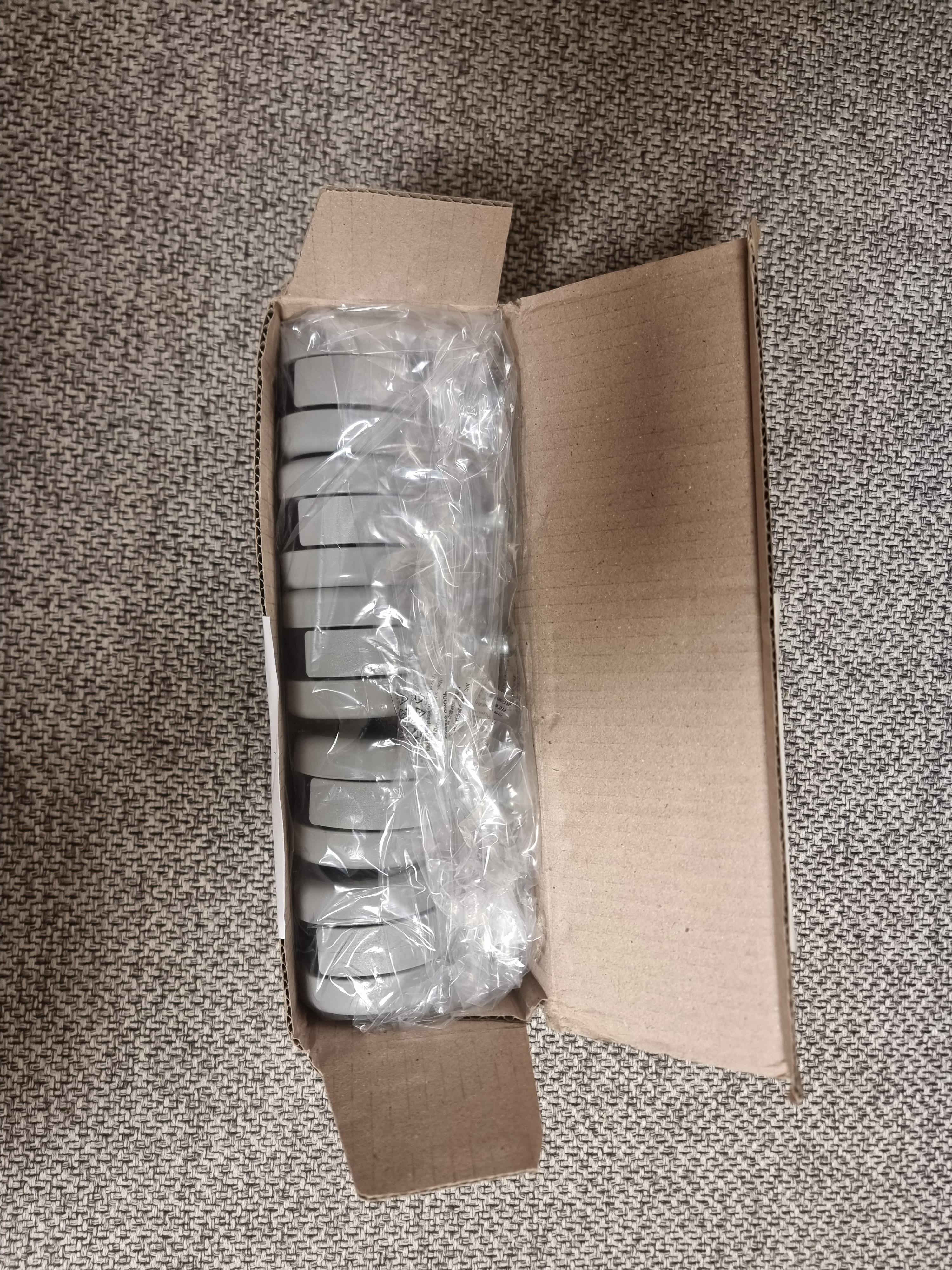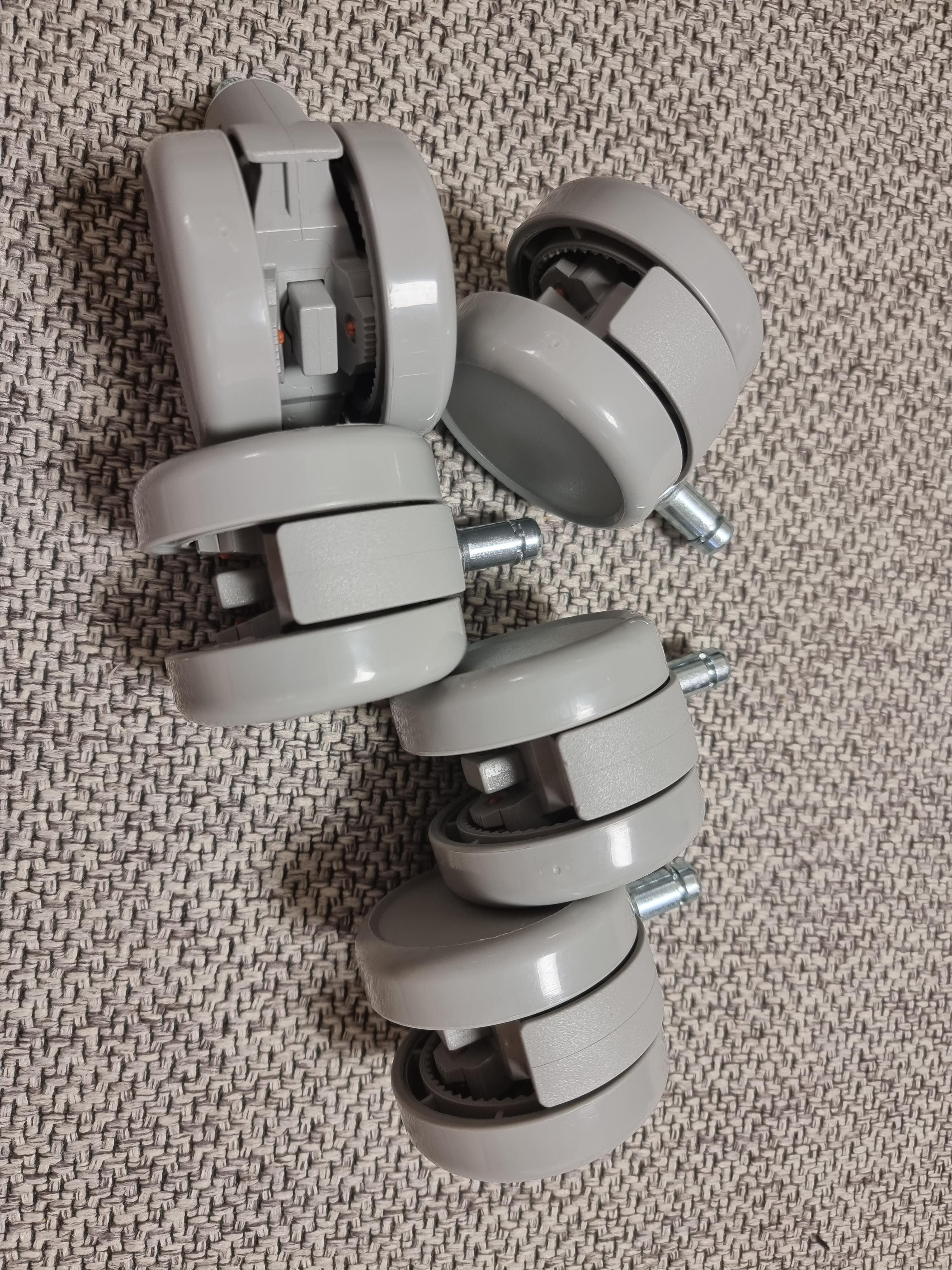 싯브레이크 캐스터를 추가로 구매했습니다. 이번 바퀴가 굴러가는걸 방지해주는 역할을 하는 바퀴입니다. 약간 자동차의 브레이크를 밟는 듯한 원리로 해가지고 사람이 앉아있을 땐 브레이크가 걸려서 의자가 덜 움직이게 만들어주는 상품이에요. 총 5개가 들어있더군요.