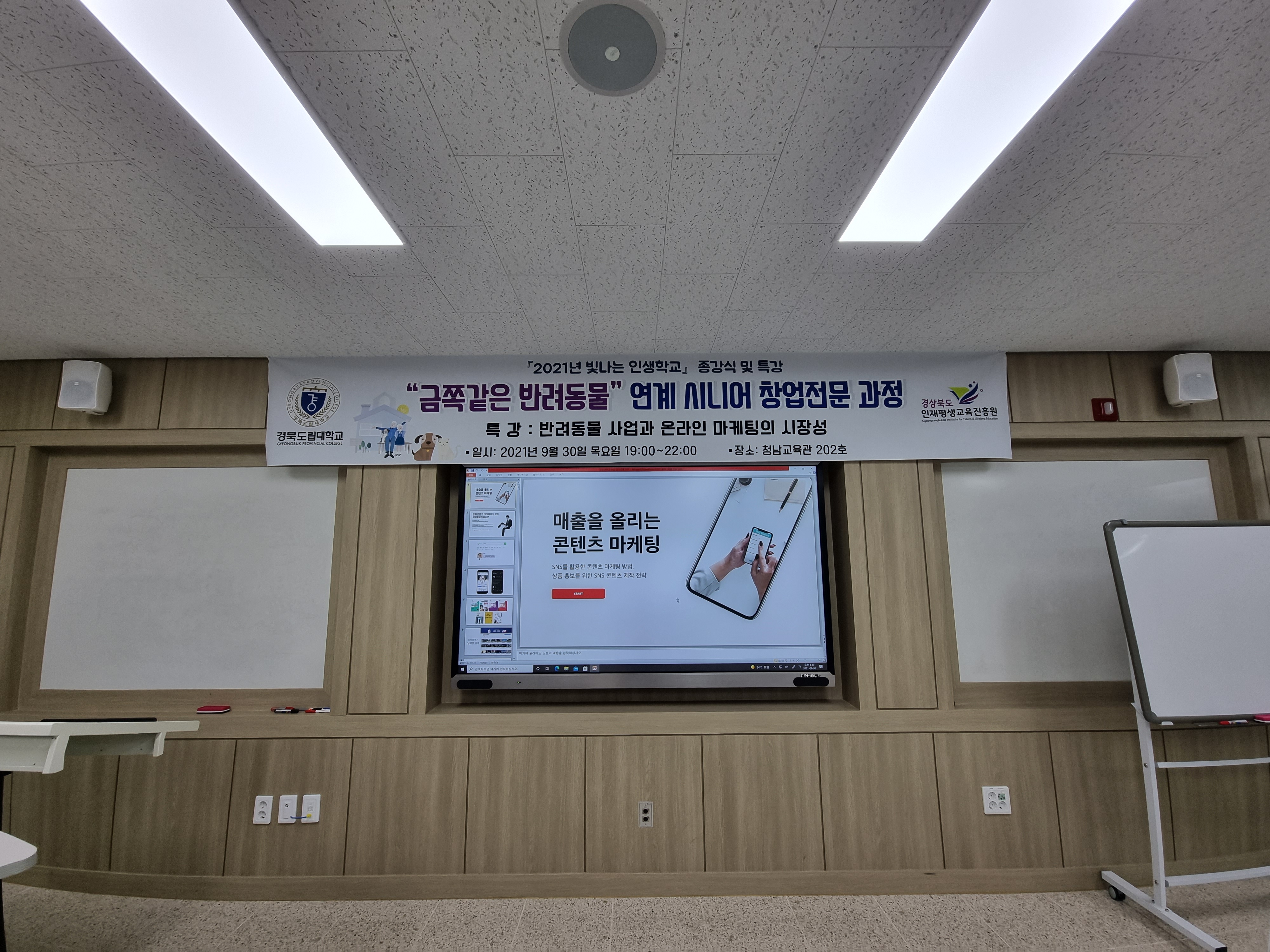 경북도립대학교에서 진행된 반려동물 창업전문 과정 중 일환으로 시니어 창업전문 과정 수강생 및 관계자분들을 대상으로 SNS 마케팅 관련 특강을 다녀왔습니다.