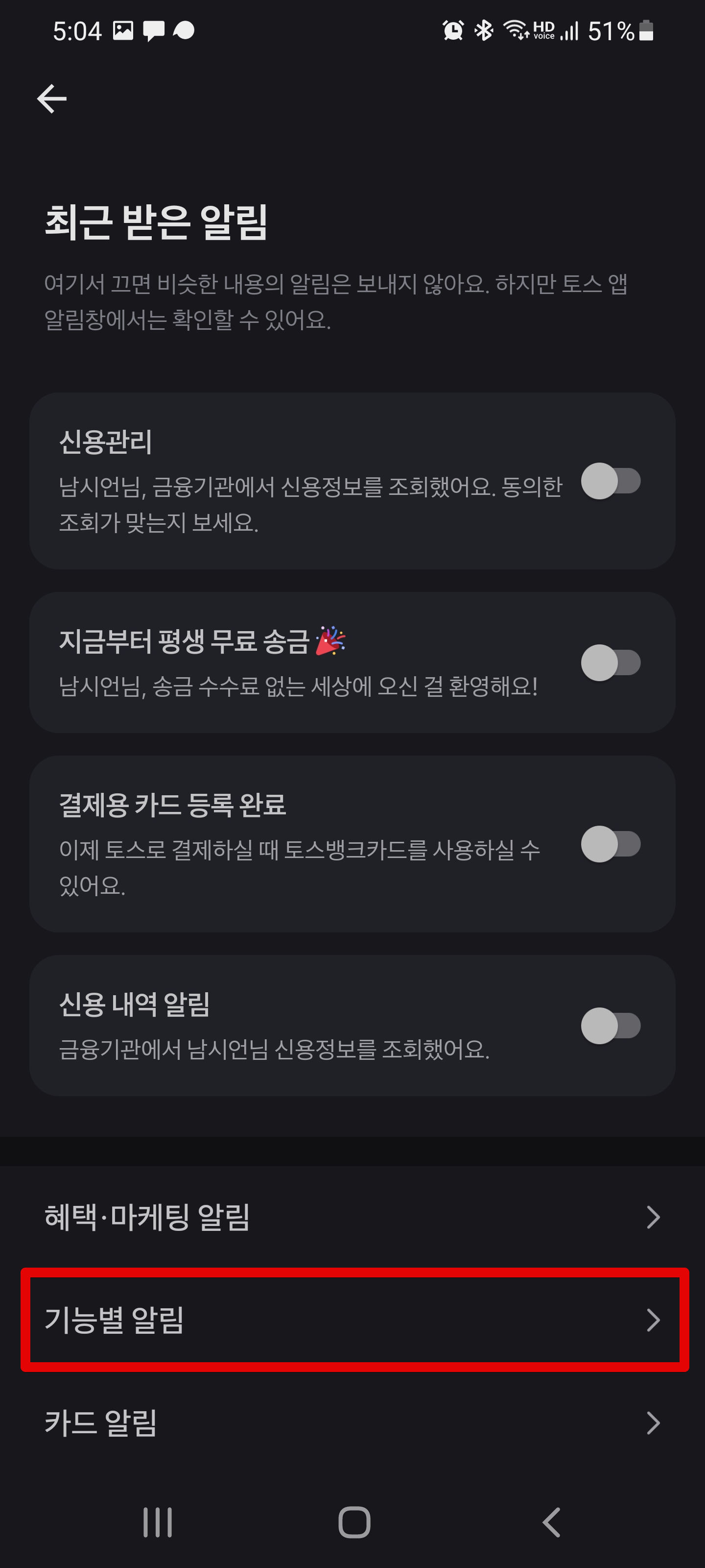 그 다음에 알림 메뉴로 들어가서 제일 아래쪽에 있는 기능별 알림으로 들어가세요.