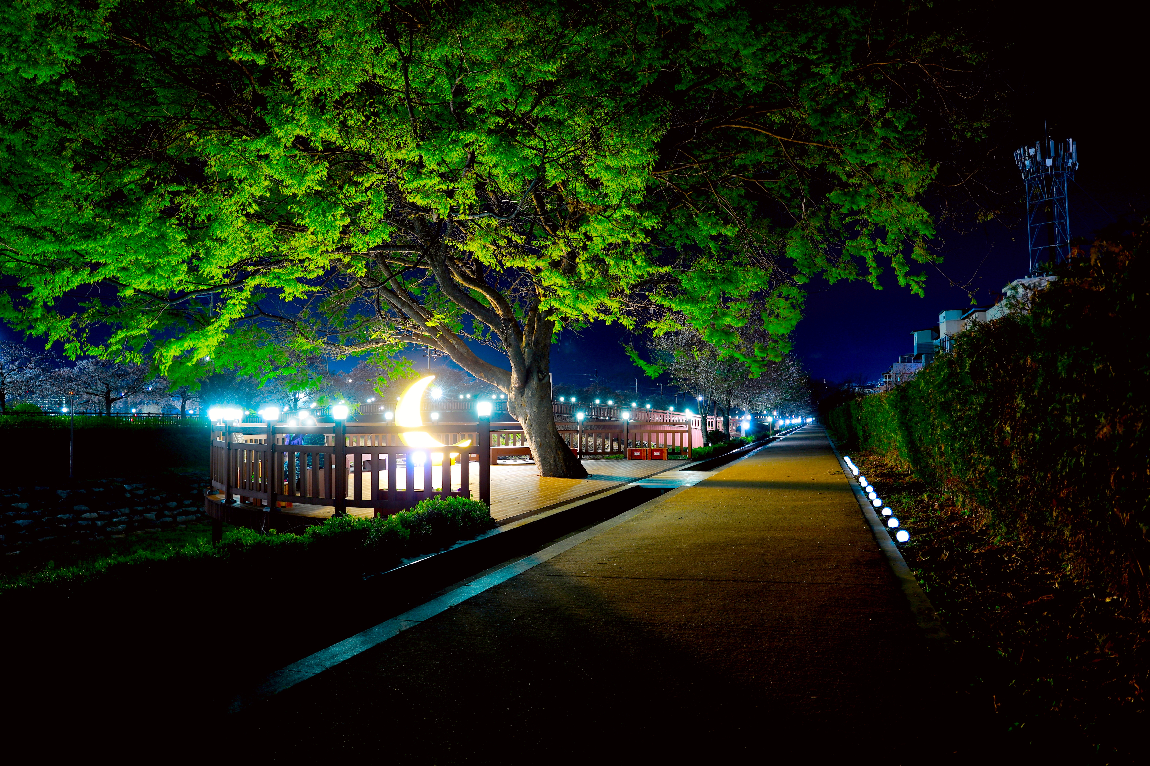태화동 산책길에 있는 달모양 조명과 예쁜 나무입니다. 야간에 삼각대를 설치하고 장노출로 담았습니다.