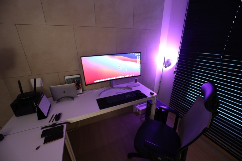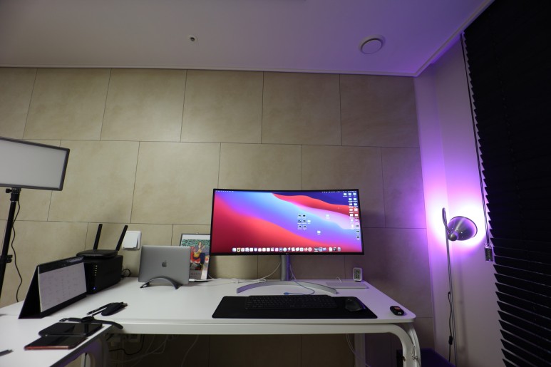 - 제품 : M1 맥북에어, LG 38인치 커브드모니터(LG 38WN95C), 삼성 무선충전 트리오, 룩스패드 43H 조명 2개, 시놀로지 NAS, 로데 NT USB Mini 마이크, 블루 예티 마이크, 로지텍 MX Keys 무선 키보드, 로지텍 MX Master 3 무선 키보드