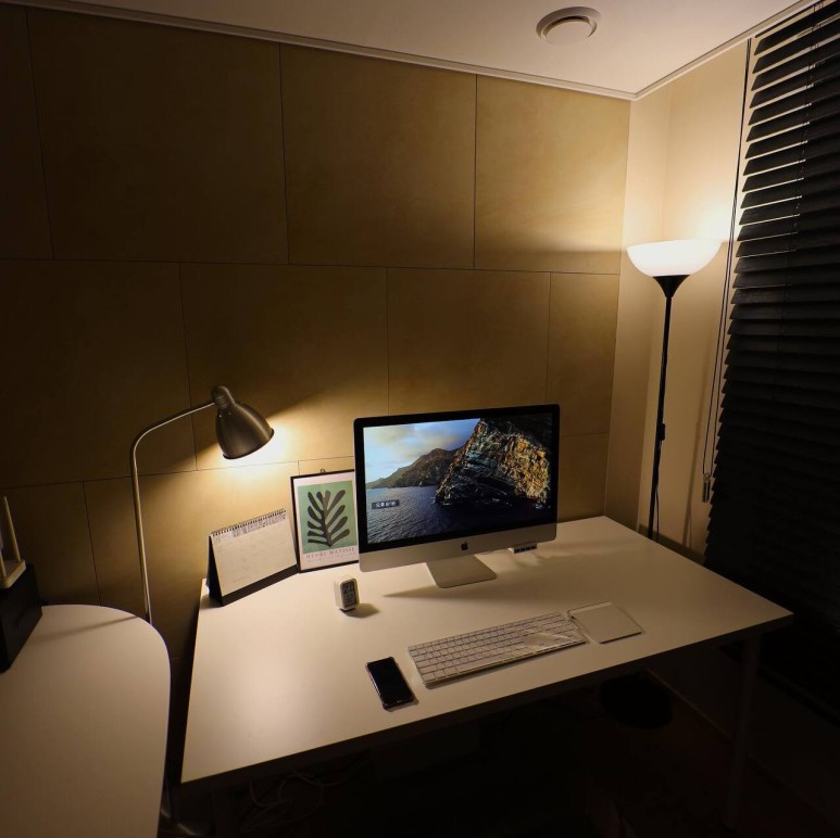- 제품 : 룩스패드43H, 삼각대, 아이맥 5K, 기계식 키보드, 로지텍 유선 마우스 G1, 로지텍 웹캠, 이케아 조명 + 샤오미 이라이트 2세대 스마트 LED 칼라 전구