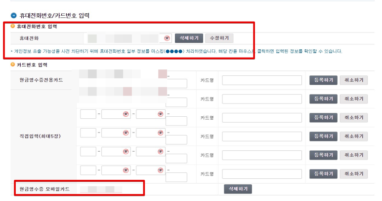 등록해둔 휴대폰 번호를 확인하세요. 모바일에서 현금영수증 카드를 발급받았다면, 아래쪽에 추가로 현금영수증 모바일 카드 번호도 확인할 수 있습니다. 끝!