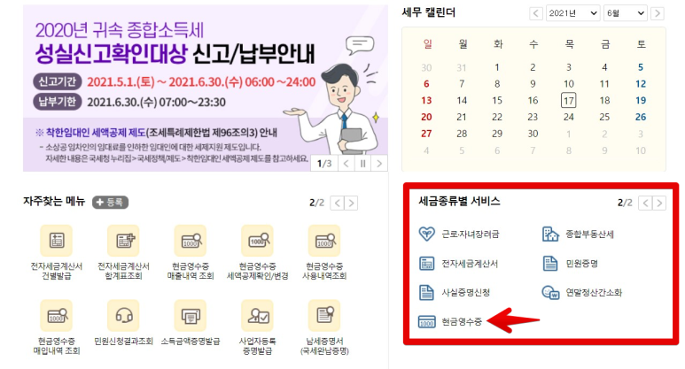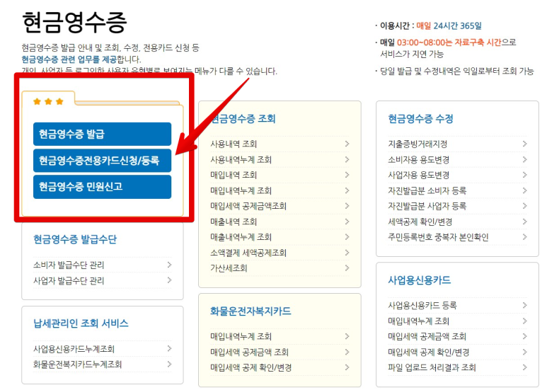 오른쪽 메뉴에서 세금종류별 서비스 2번째 항목으로 가면 현금영수증 버튼이 있습니다.