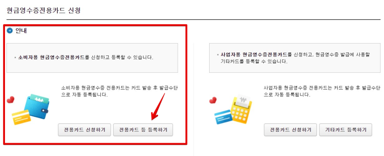 소비자용 현금영수증 전용 카드 등록하기 버튼을 누릅니다. 사업자용일 경우 오른쪽 메뉴를 이용하세요.