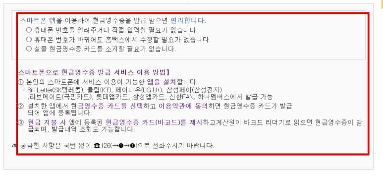참고로 요즘에는 휴대폰 번호없이 앱을 깔아서 앱 안에 있는 바코드를 이용해 현금영수증 처리도 가능합니다.