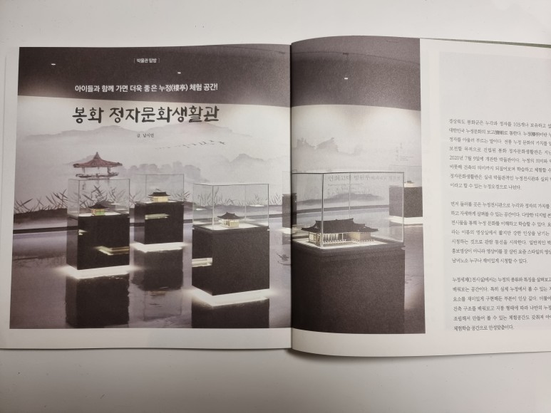 저는 이 잡지의 마무리 투수로서 박물관 탐방 꼭지를 맡고 있습니다. 이번호에서는 봉화에 있는 정자문화생활관을 소개했습니다. 정자 문화와 누정과 관련된 다양한 역사와 이야기를 학습하고 체험할 수 있는 공간입니다.