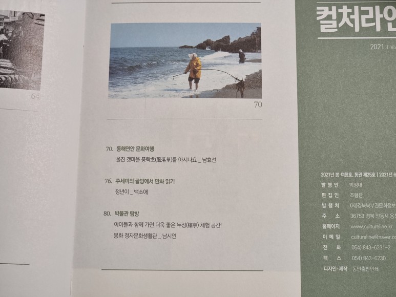 울진 갯마을 풍락초와 만화 정년이, 그리고 봉화 정자문화생활관 소개로 알차게 꾸며져 있습니다. 통권 25호 되겠습니다.