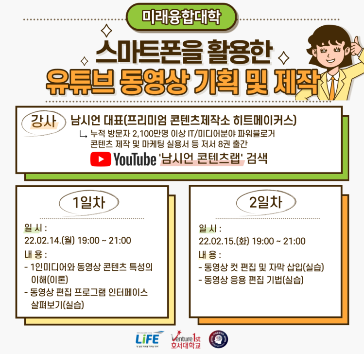 호서대학교 미래융합대학에서 진행하는 정보통신활용기술 증진 특강 프로그램으로 유튜브 동영상 기획 및 제작 특강을 진행하였습니다. 이 강의는 학교측에서 동계방학 특강 프로그램 주제 수요조사에서 유튜브 영상 제작이 선정되어 진행되었다고 합니다.
