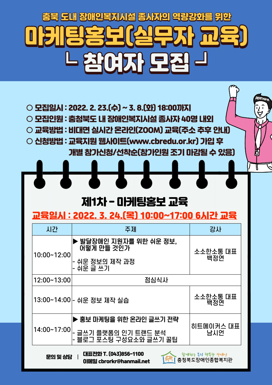 충북 도내 장애인복지시설 종사자의 역량강화를 위한 마케팅 홍보 실무자 교육에 초청받아 스피커로 나섰습니다. 저는 홍보 마케팅을 위한 온라인 글쓰기 전략이라는 주제로 약 3시간 정도 관계자분들을 모시고 강의를 진행하였습니다.
