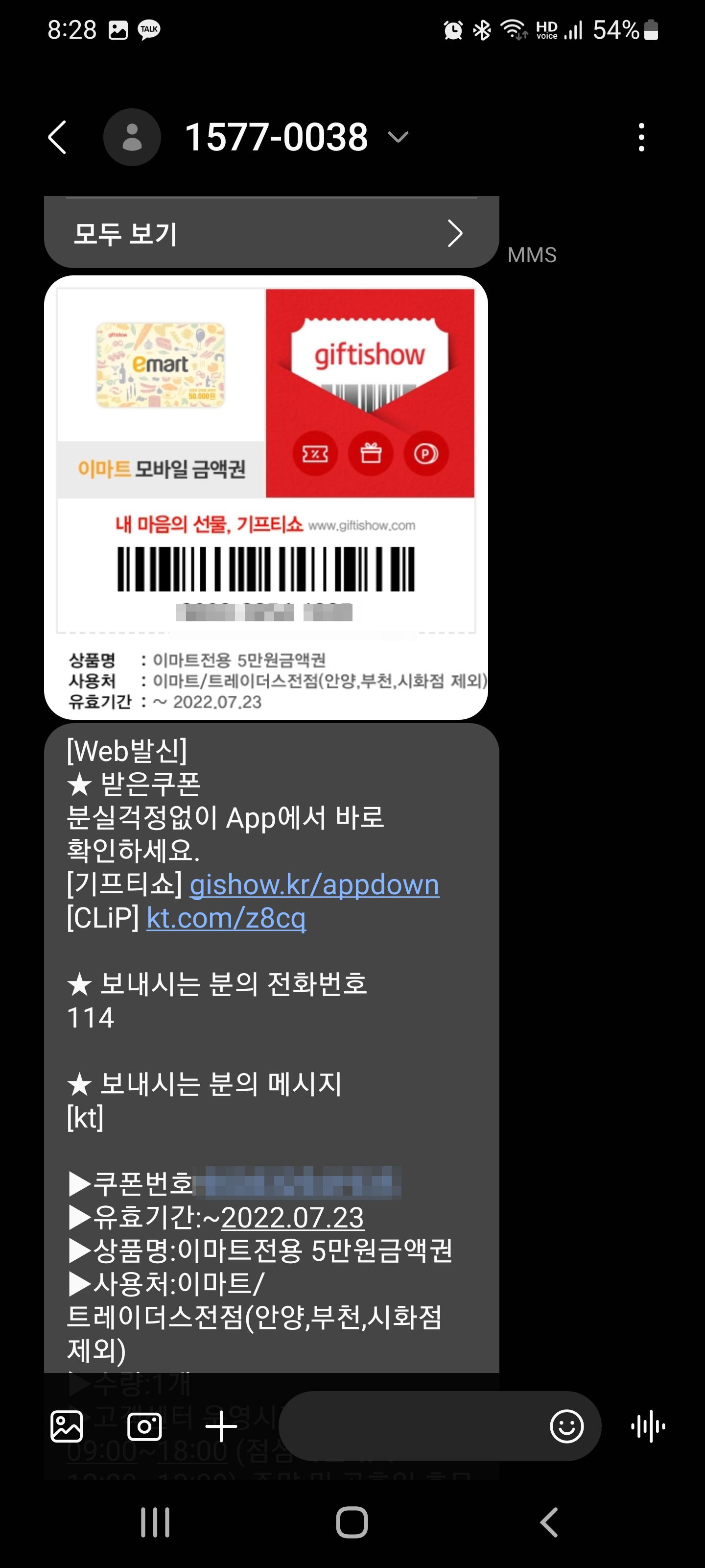 아무튼 통화로 이런저런 이야기를 나누다가 재약정을 하는 조건으로 상품권을 받기로 했습니다. 신세계 상품권을 받고 싶었는데 마침 다 떨어졌다고해서 이마트 모바일 금액권을 받았습니다. 이건 인터넷에서는 못쓰고 기프티쇼 같은거라서 현장에서만 쓸 수 있더라고요.