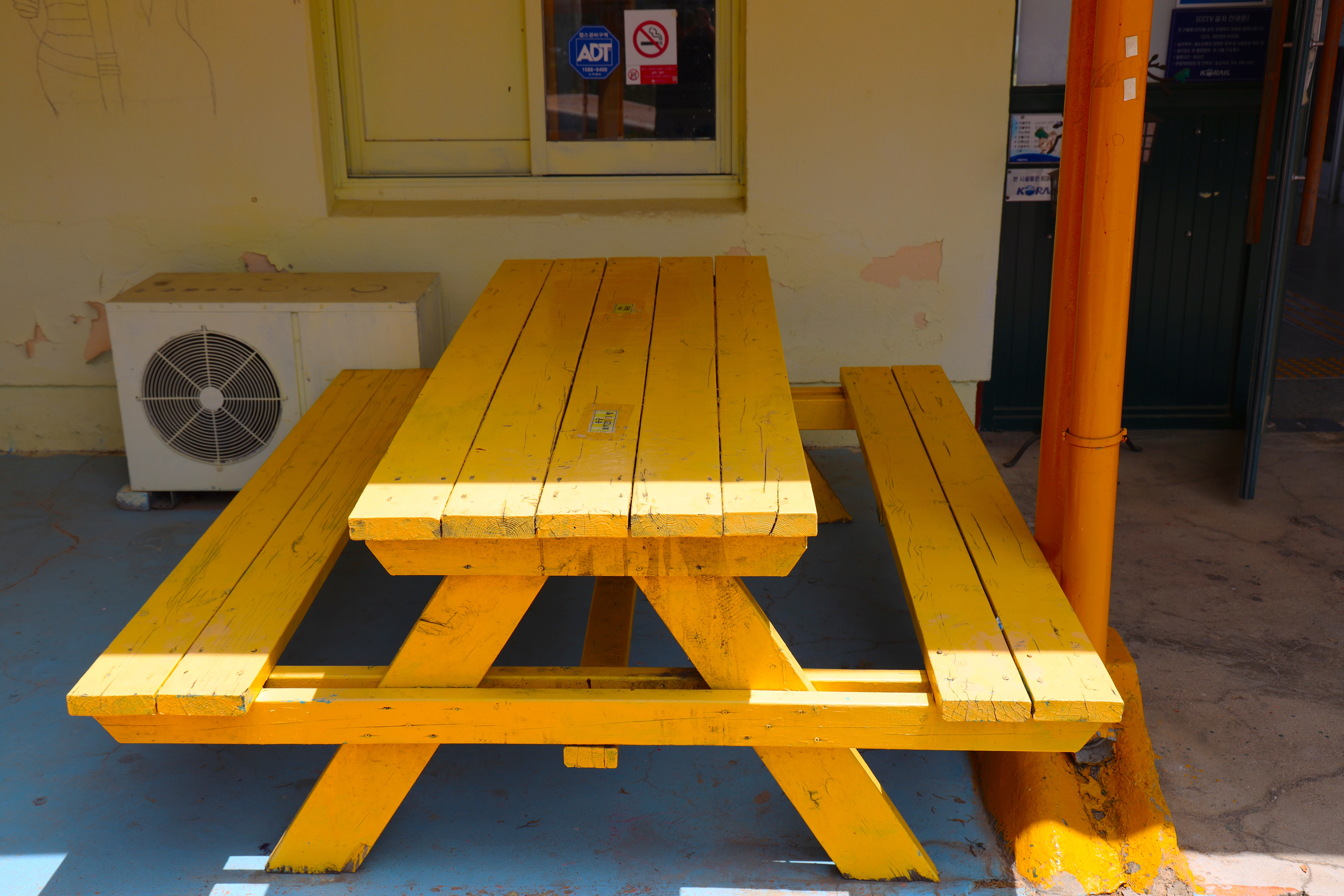 용궁역 안쪽에서 상징과도 같은 핑크색, 그리고 노란색 테이블에 잠시 앉아 휴식을 취해보았습니다. 용궁역 특유의 조용함과 포근한 분위기가 참 좋았던 기억으로 남았습니다.