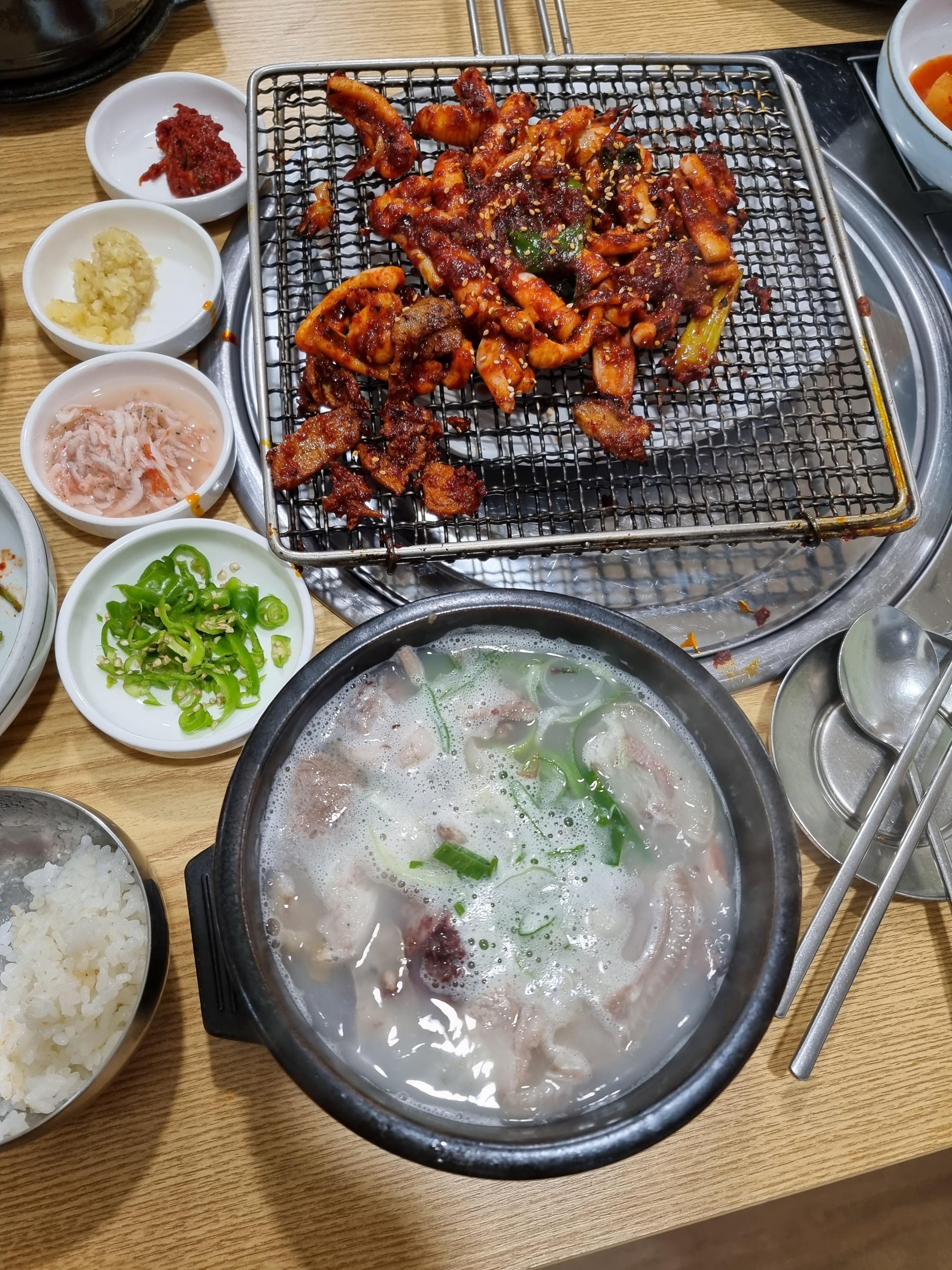 오징어석쇠구이의 불맛과 매콤한 맛, 그리고 국밥의 든든한 맛이 잘 어울리는 일품 식단입니다 ㅎㅎ