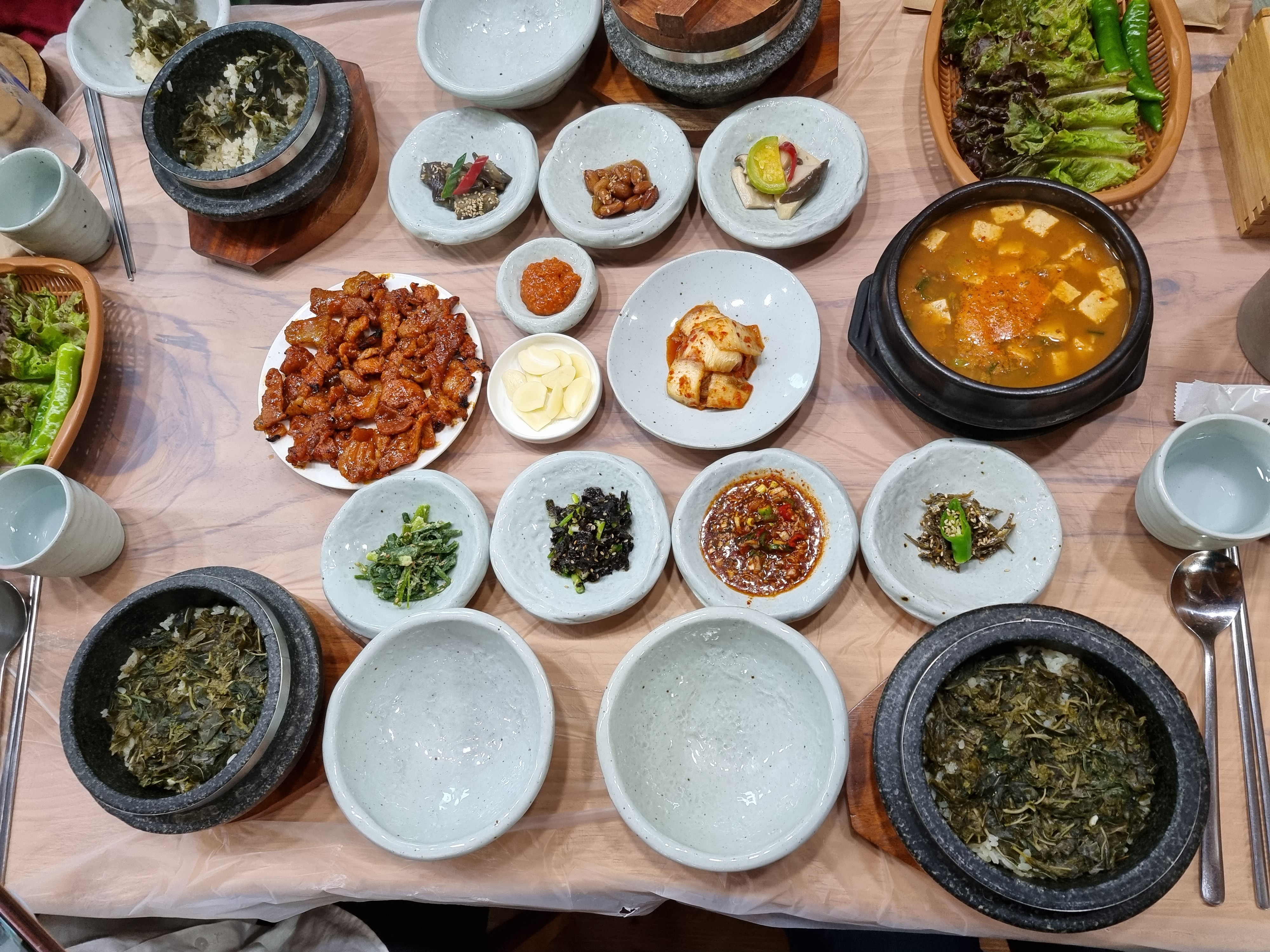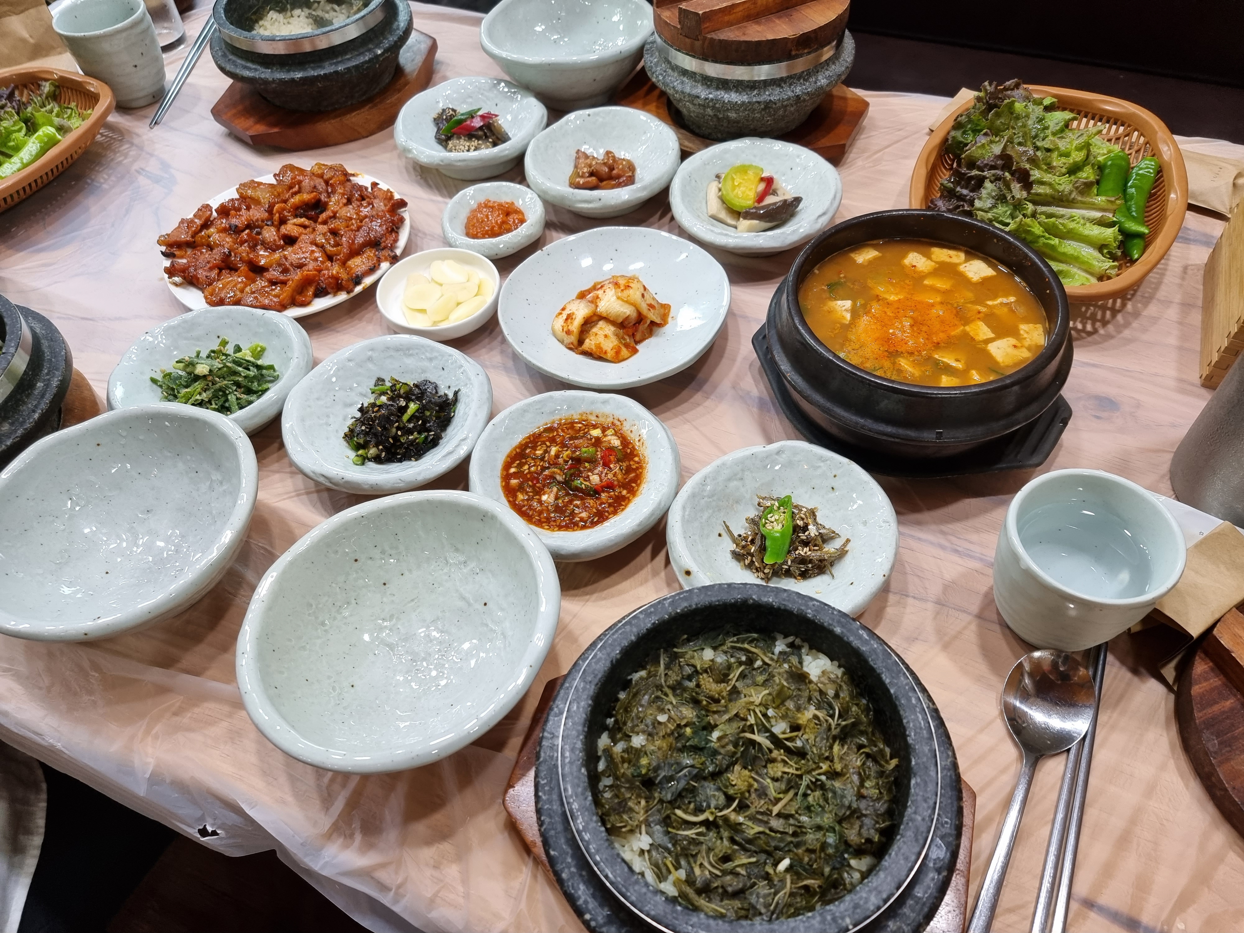 전체 풀샷이에요. 덜어먹는 청국장이 추가되었습니다. 예천 토담이 또 청국장으로도 유명한 곳이라서 청국장을 기대했었는데 청국장도 맛이 정말 훌륭했어요.