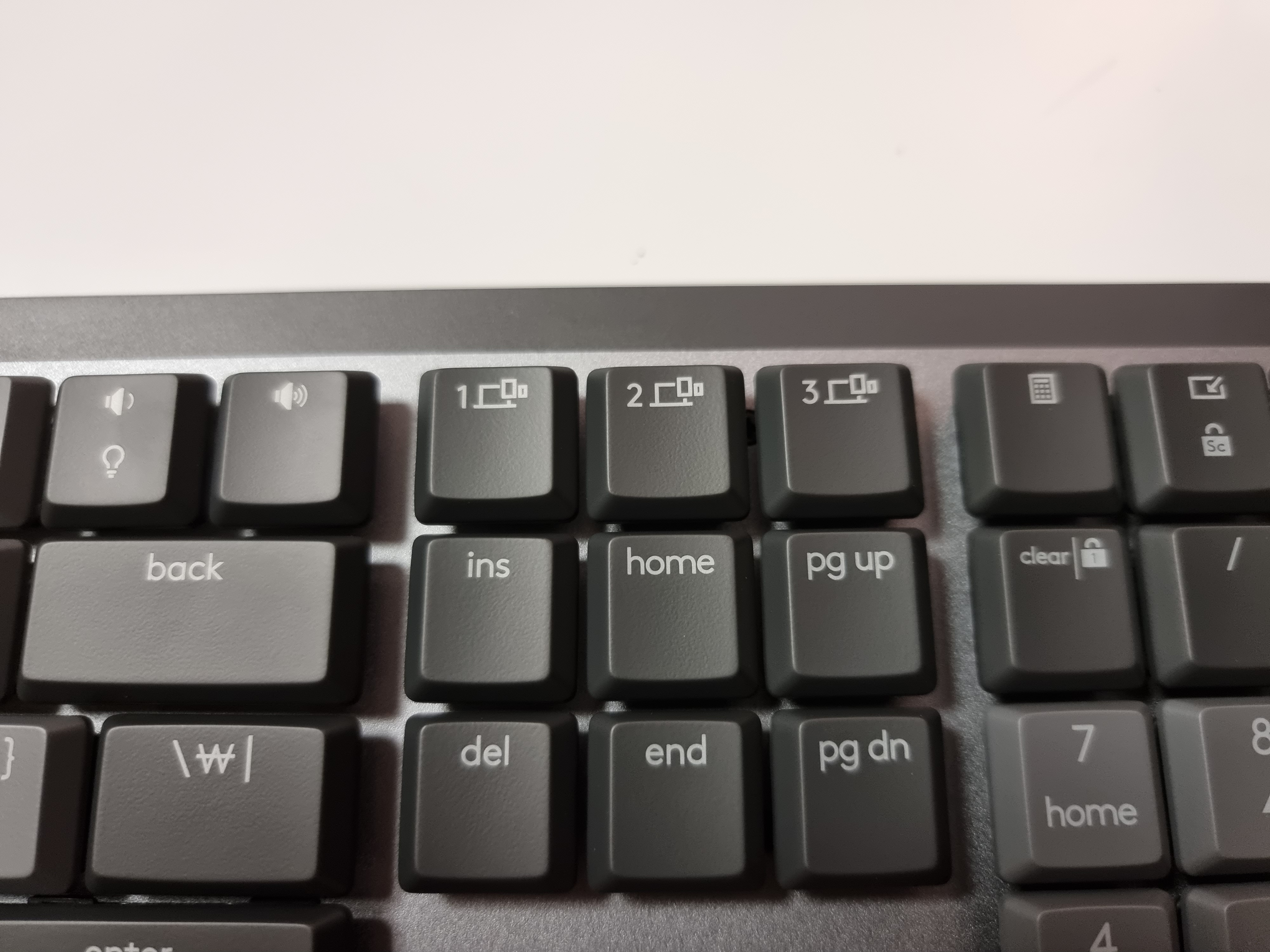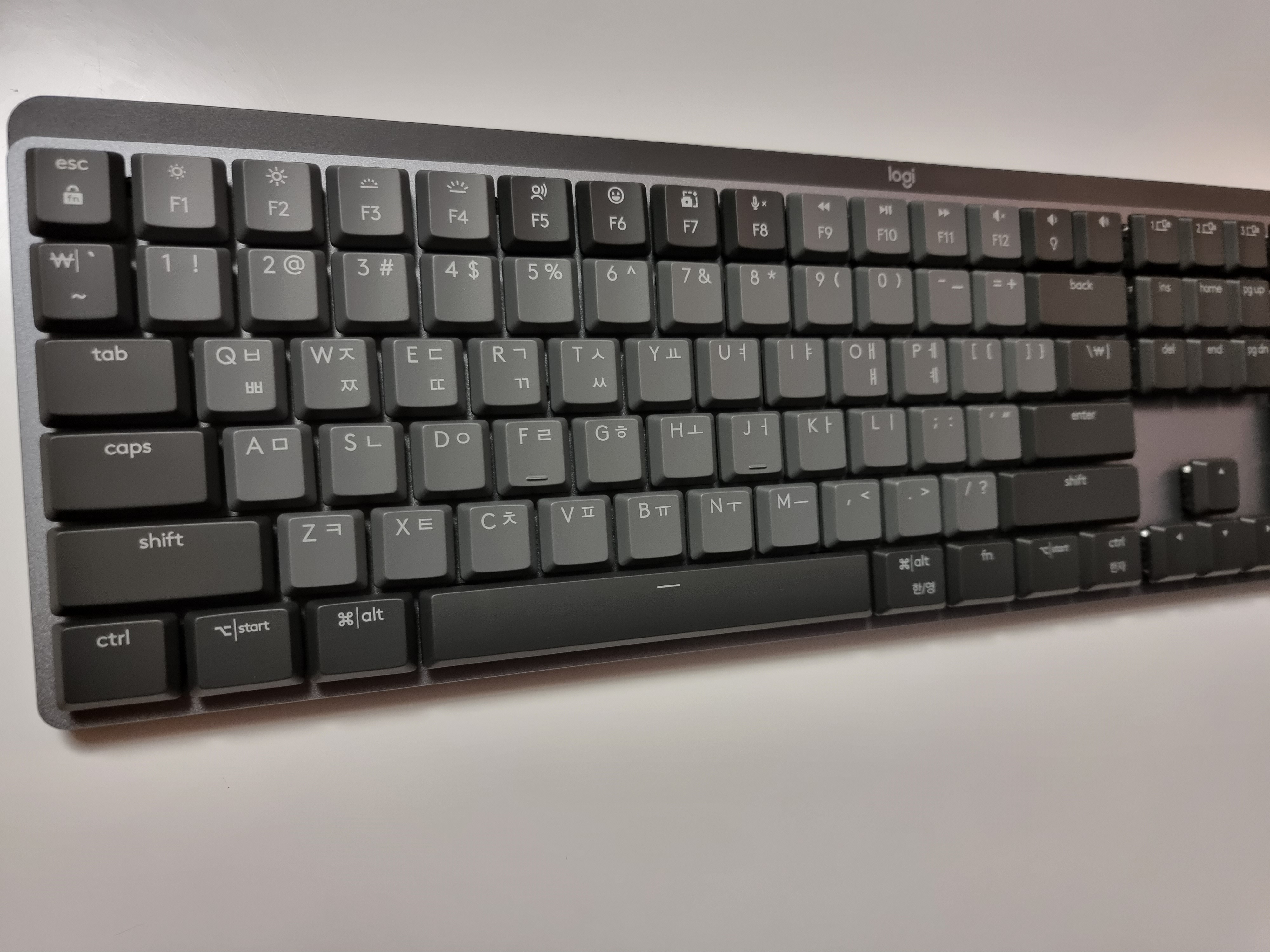 MX KEYS와 비교했을 때, 펑션키들도 전체적으로 크기가 줄어들고 배치가 왼쪽으로 치우쳐진 모습입니다. 기존에 적응되었던 F3번의 위치가 지금 로지텍 MX MECHANICAL 키보드에서는 F4번쯤 됩니다.