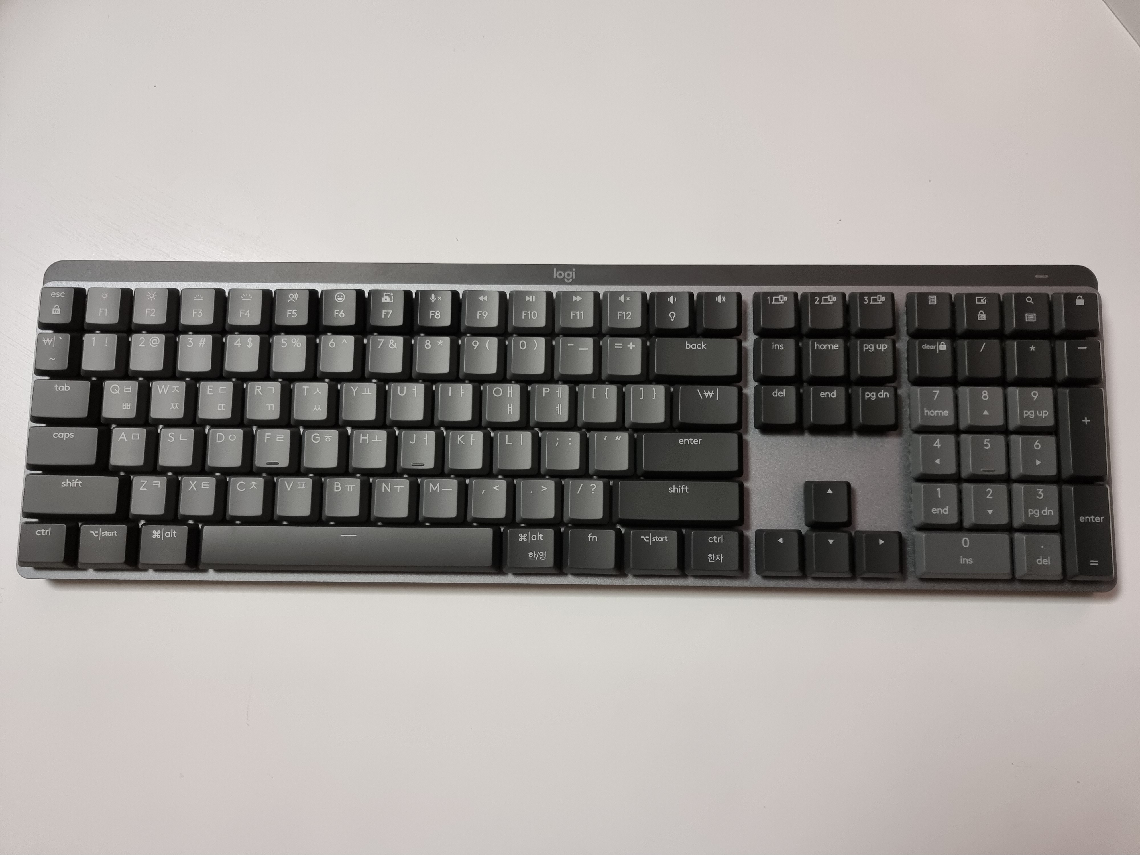 전체적으로 짱짱하고 깔끔한 디자인과 만듦새를 자랑하는 제품입니다. 한가지 아쉬운건 MX KEYS와 비교했을 때 스페이스 오른쪽 기준으로 키가 원래 3개 였는데 4개로 늘어나면서 하나하나의 키 가로 크기가 작아진 부분이 있고요.
