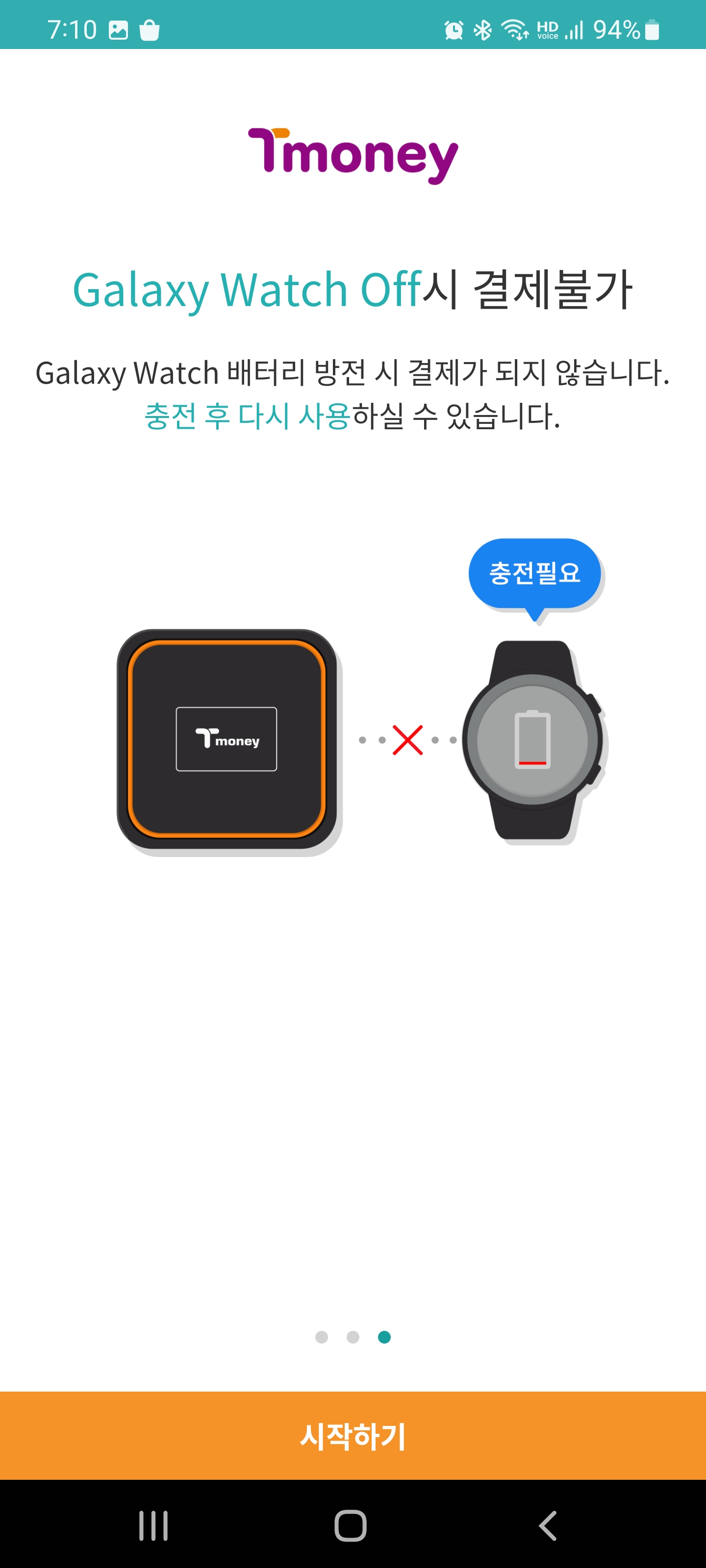 갤럭시 워치로 티머니를 이용할 수 있어서 참 유용한 것 같습니다. 처음 실행하면 위와 같은 화면이 나옵니다. 여기에서 주 교통카드를 설정해서 선불 충전형으로 하거나 후불형으로 카드를 등록해두고 사용을 하면 됩니다. 배터리가 없어서 워치가 꺼지면 사용이 안된다고 나와있으나 이 부분은 당연히 예상할 수 있는 부분입니다. 보통 스마트워치는 항상 켜져있기 때문에 워치가 배터리 없어서 꺼져서 사용을 못 할 일은 거의 없을 것 같아요.