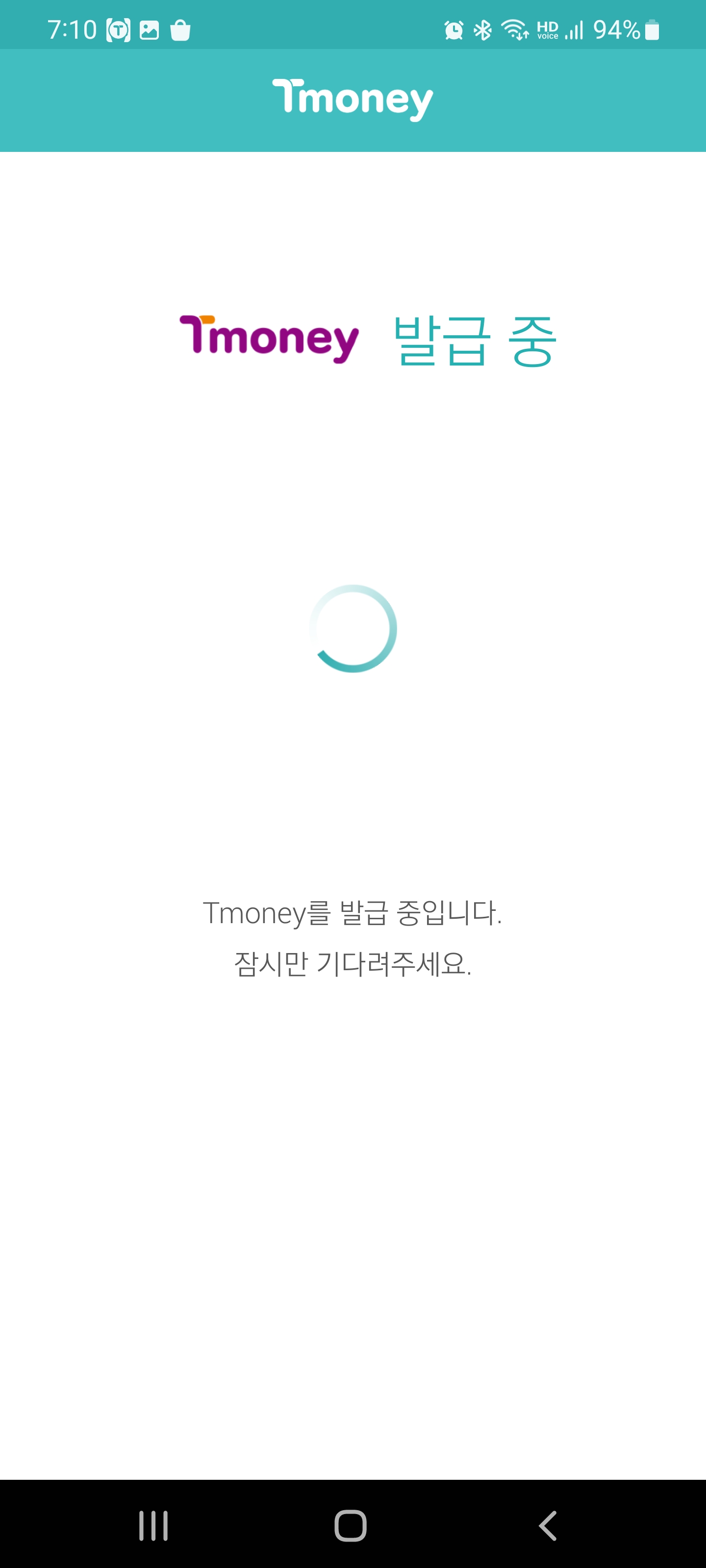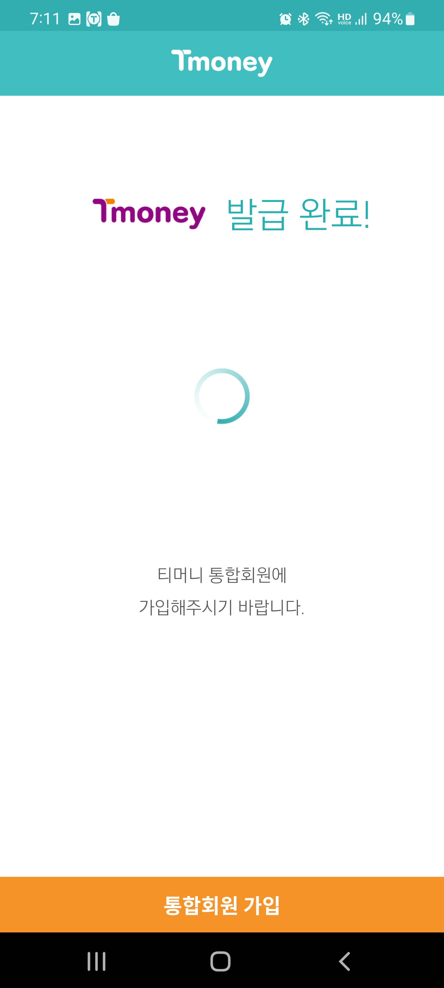 처음 시작하면 티머니 발급 중이라고 나오고 티머니 통합회원으로 가입을 하라고 나옵니다. 저는 과거에 티머니 통합회원으로 가입했던적이 있어서 기존 아이디로 로그인을 해주었습니다.
