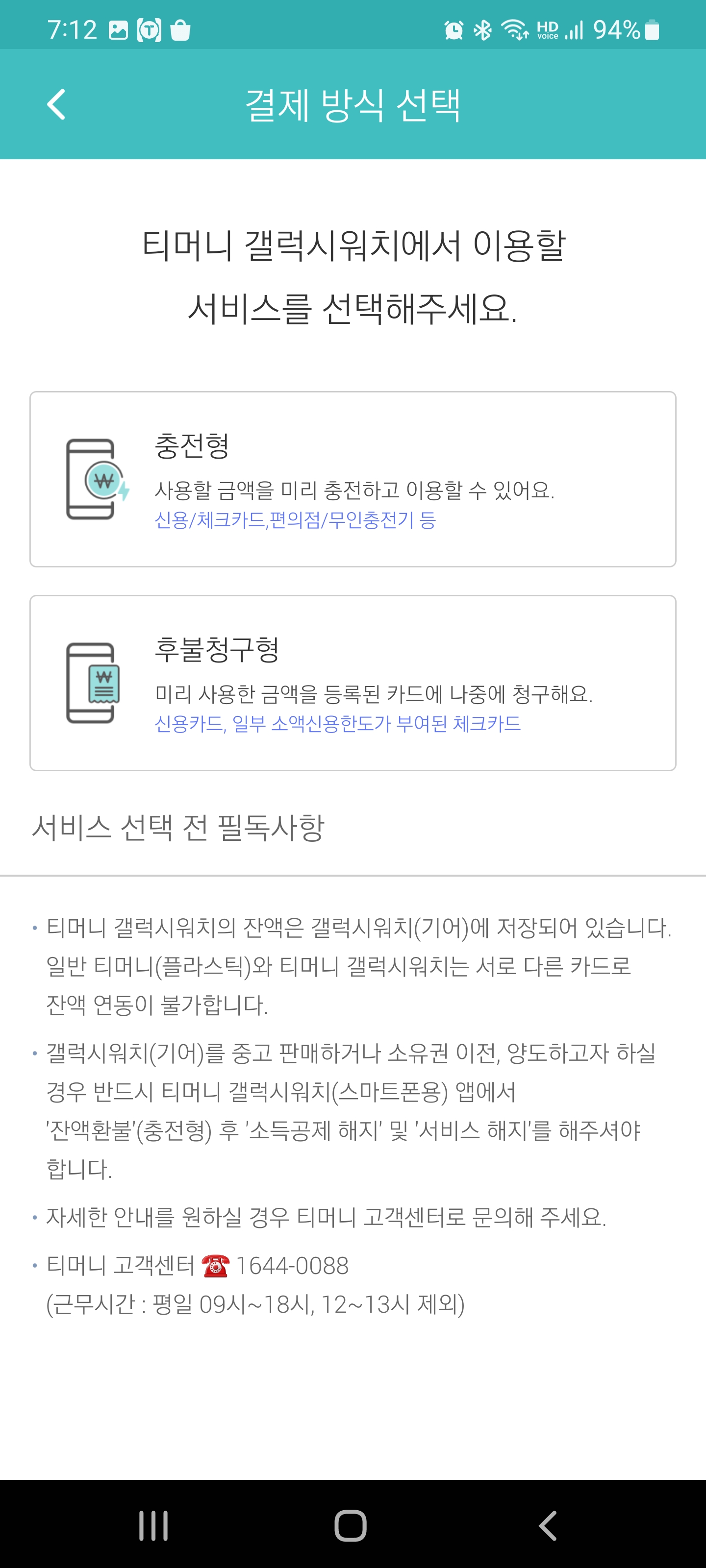 마지막으로 카드를 등록해주어야하는데요. 결제방식은 충전형이 있고 후불청구형이 있습니다. 자신이 사용하는 신용카드에 티머니 후불 교통카드 기능이 들어가 있으면 사용이 가능하다고 합니다. 직접 등록을 해보니 체크카드의 경우 후불교통카드 기능이 있다고 하더라도 후불청구형으로는 등록이 안되고 일부 체크카드와 신용카드만 후불청구형으로 등록이 가능한 것으로 보였습니다.