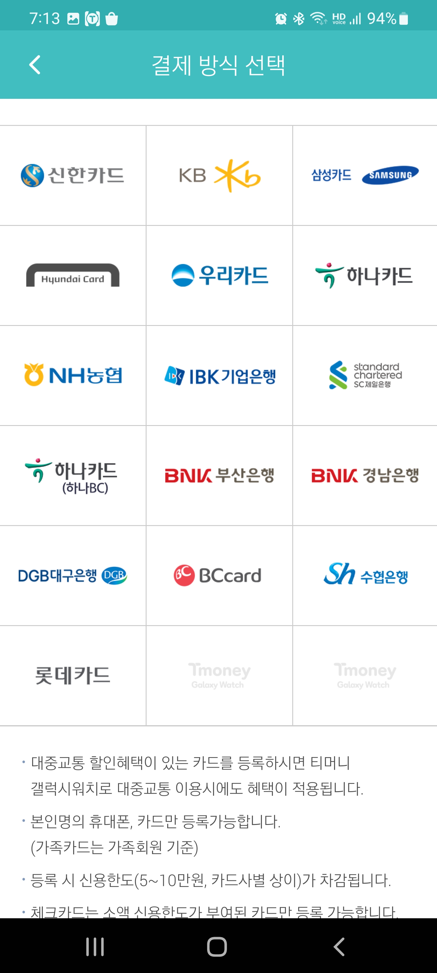 저는 NH농협카드를 쓰고 있고 후불 교통카드 기능이 지원되는 카드인데요. 신한카드, KB, 삼성, 현대, 우리, 하나, 농협, 기업은행 등 많은 은행들을 지원하고 있어서 원하는 카드를 등록하면 될 듯 합니다.
