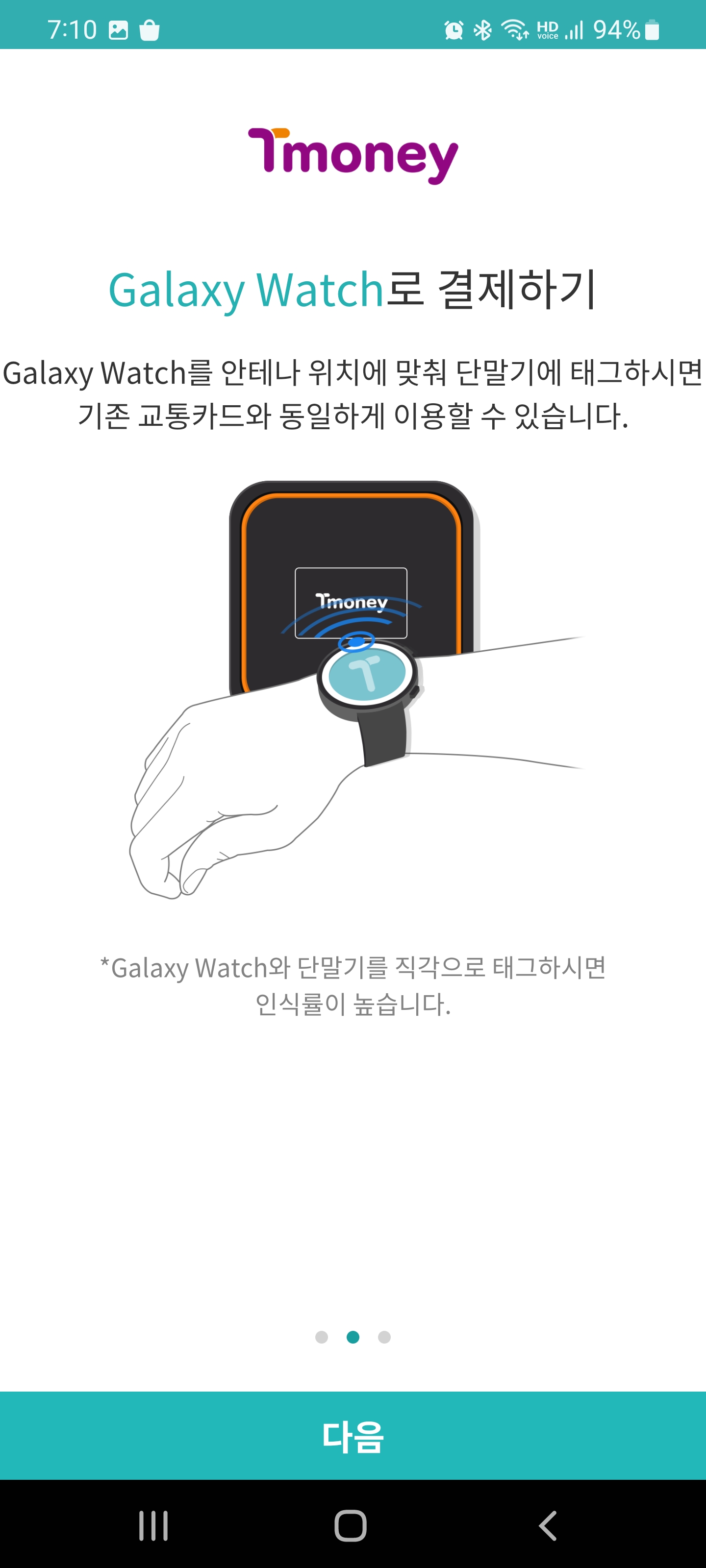 갤럭시 워치의 경우 단말기와 직접적으로 태그를 해주어야하는데 직각으로 태그를 하면 인식률이 더 높다고 하네요. 위에 나온 그림처럼 약간 옆면을 터치해주는 방식입니다.