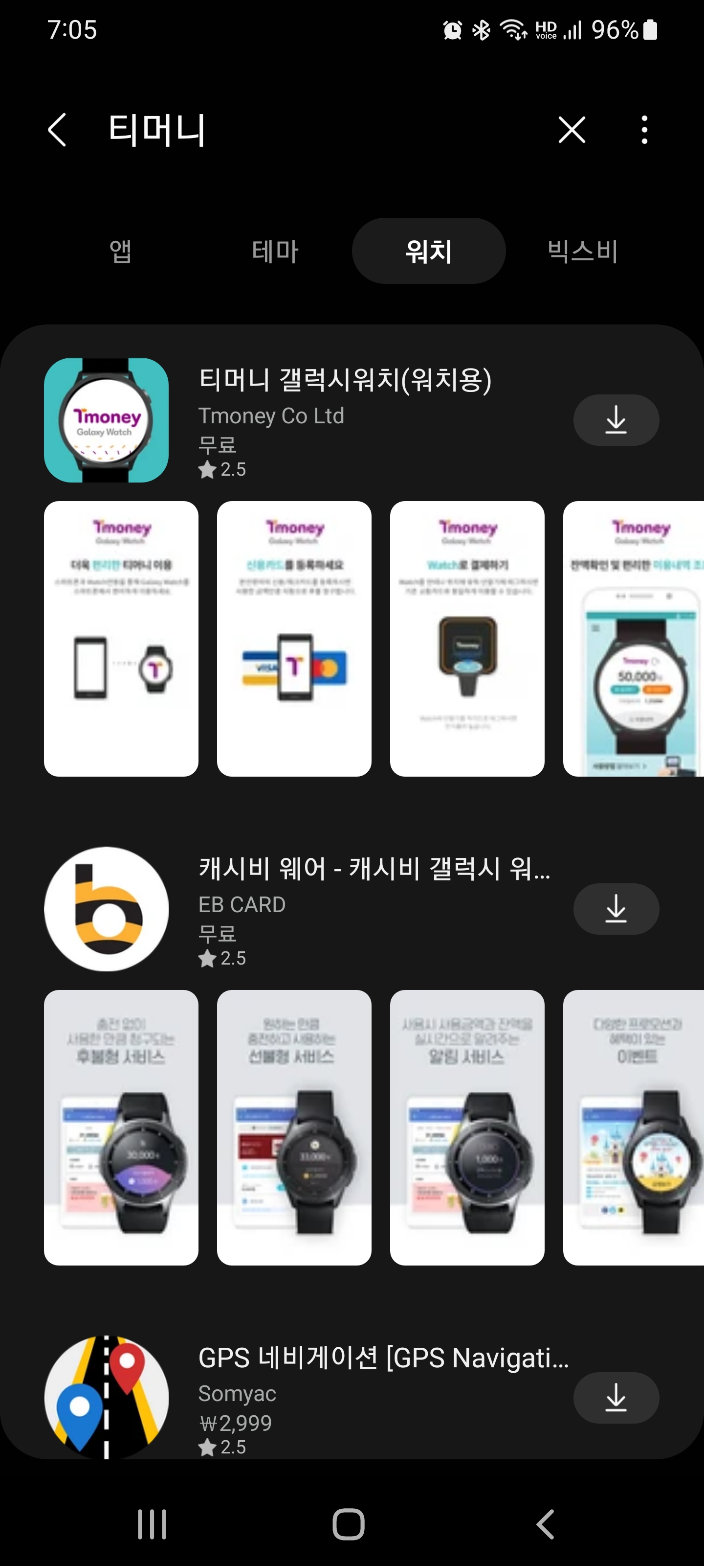제일 먼저 스마트폰에서 갤럭시 스토어 앱으로 들어갑니다. 그 다음 검색창에 티머니라고 검색해서 워치용 티머니 앱과 스마트폰용 티머니 앱을 양쪽에 설치를 해줍니다.