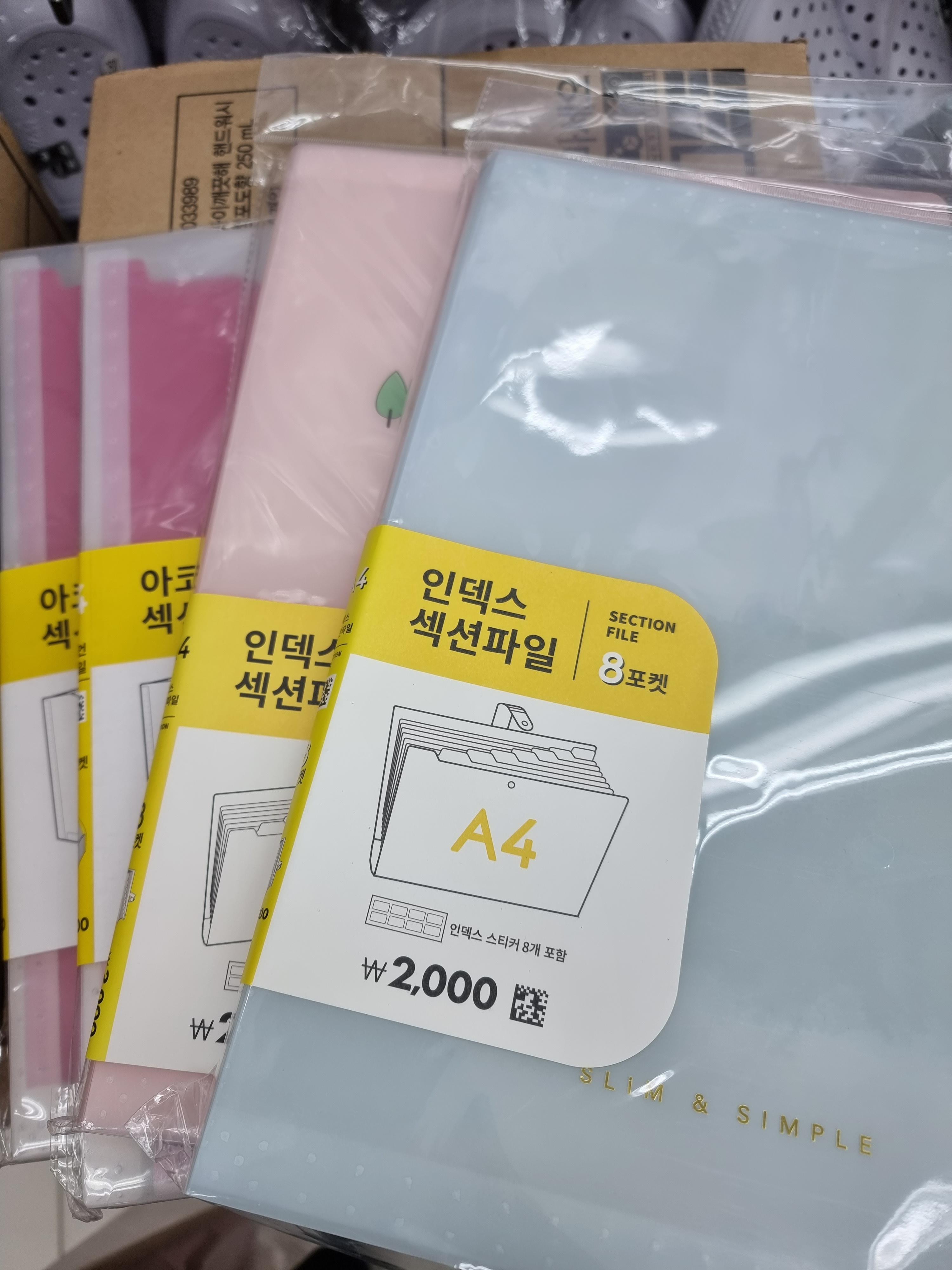 먼저 인덱스 섹션파일입니다. 옆면에 인덱스 공간이 있고 총 8칸이 제공되는 얇은 섹션파일입니다. 디자인도 몇 개가 있었는데 마음에 드는 녀석으로 2개 골라봤어요. 가격은 2천원으로 저렴합니다.
