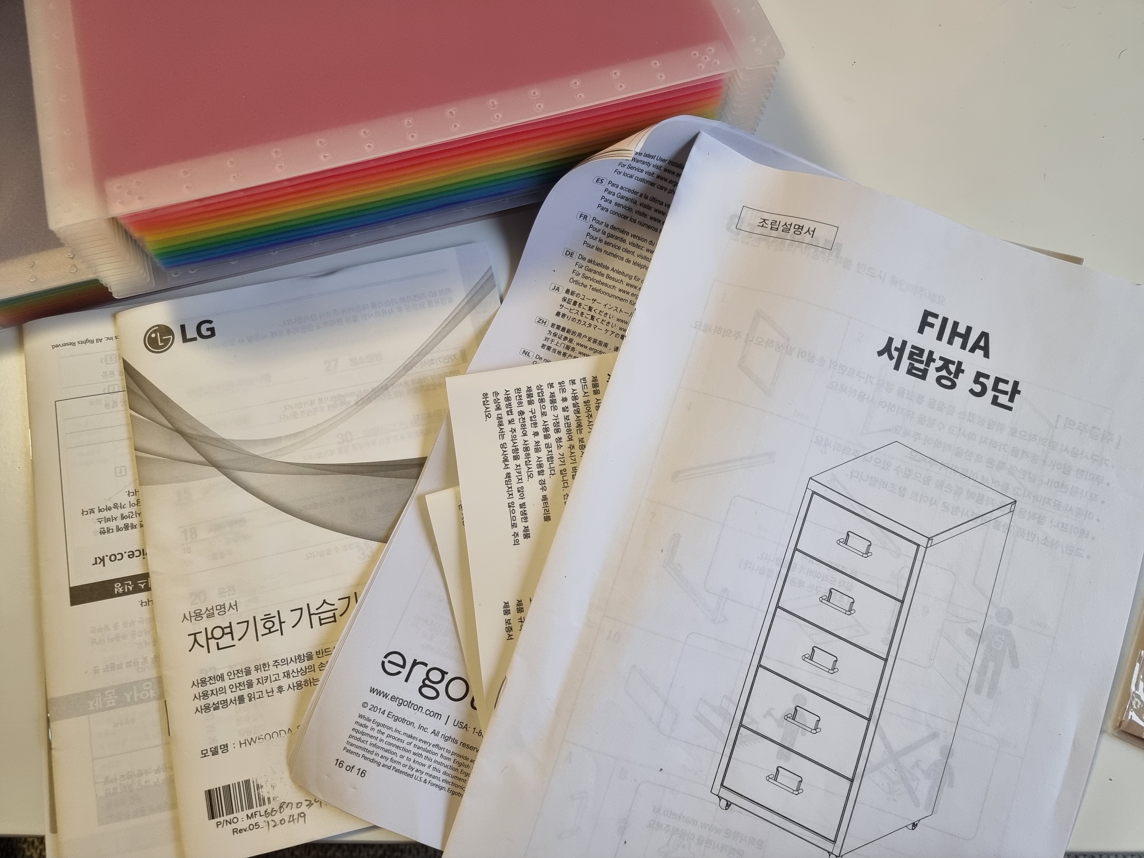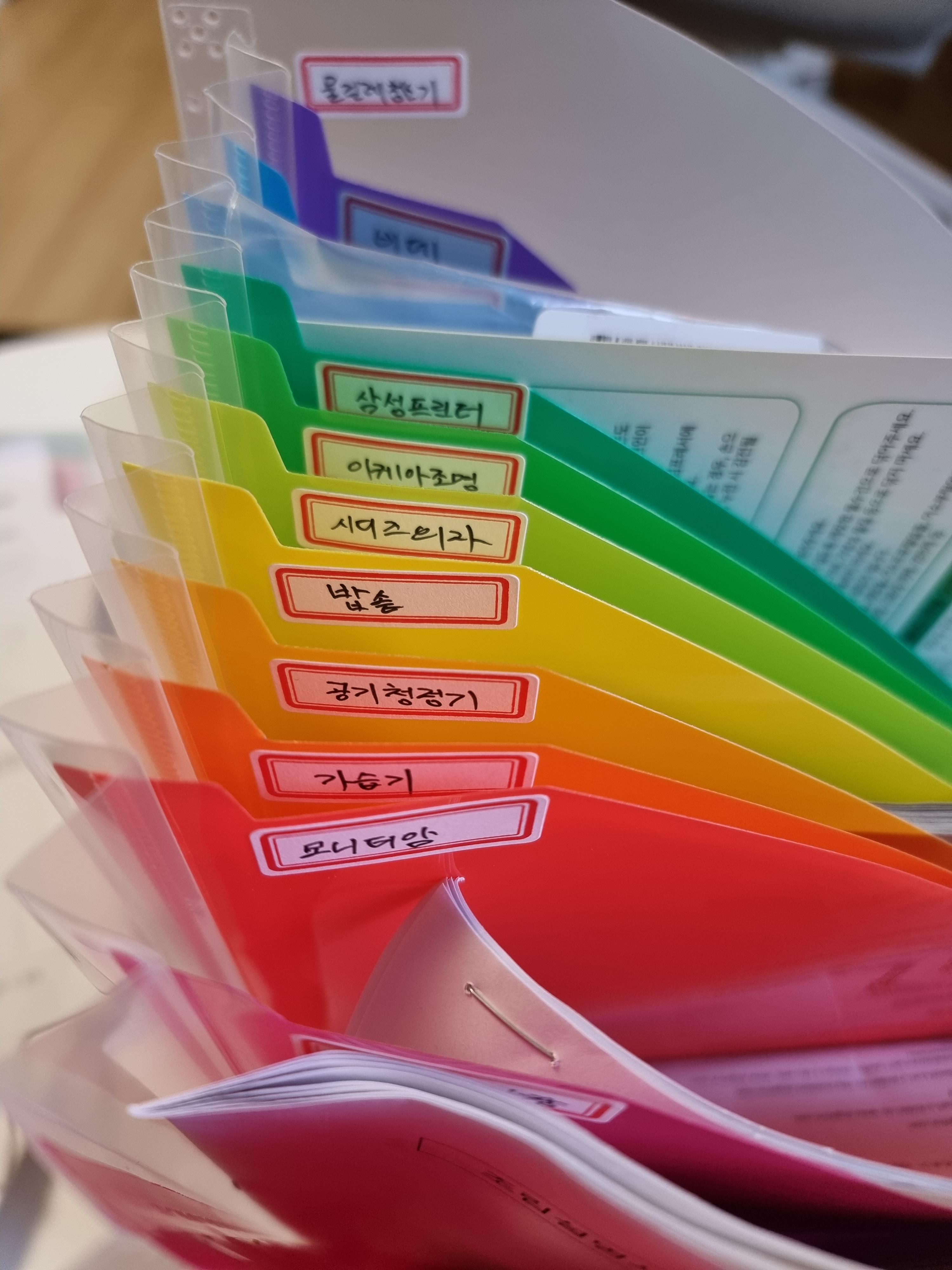 집에 굴러다니거나 서랍장에 짱박혀 있던 설명서들을 잔뜩 꺼내왔습니다. 그리고 이것들을 하나씩 넣어서 정리해주었어요.