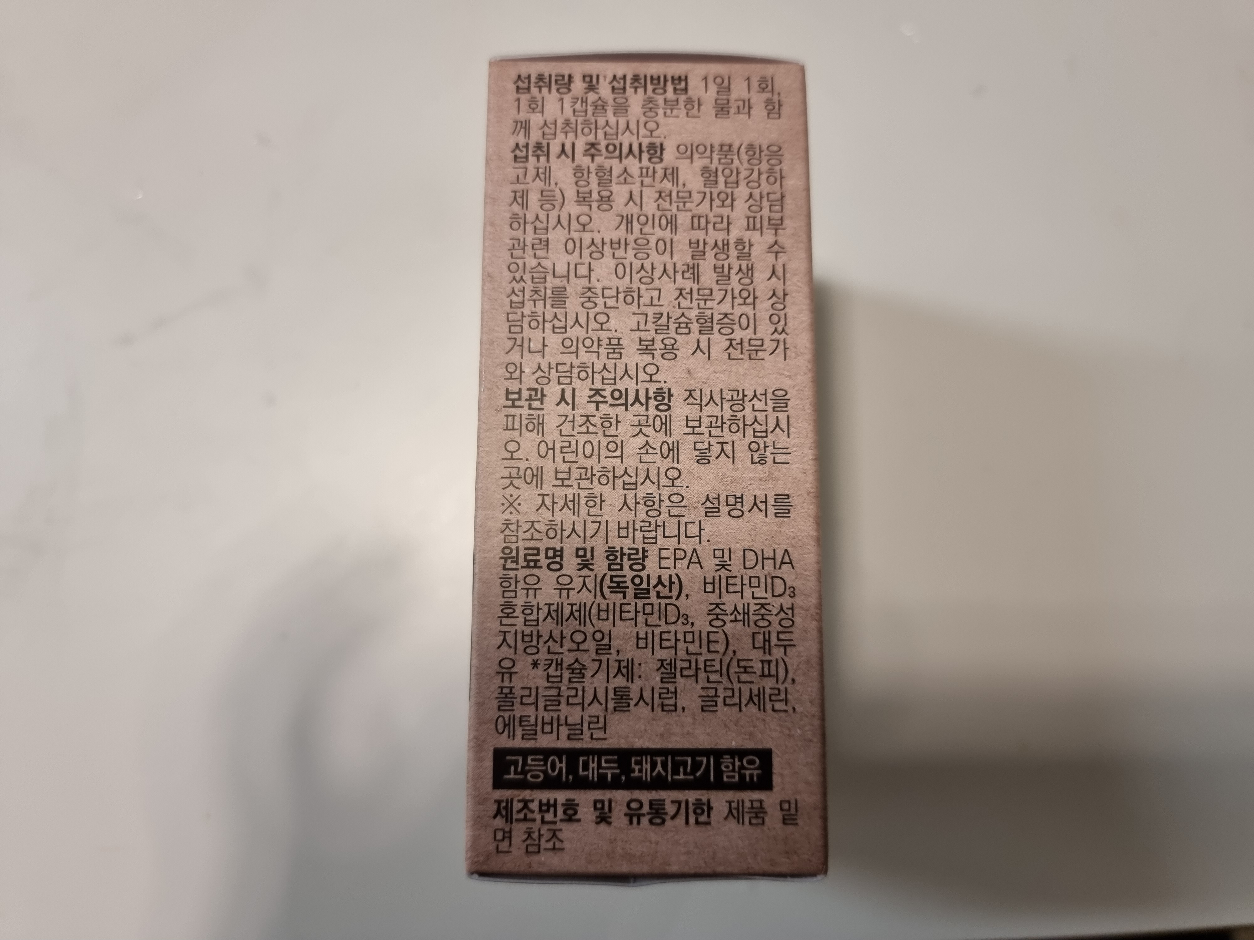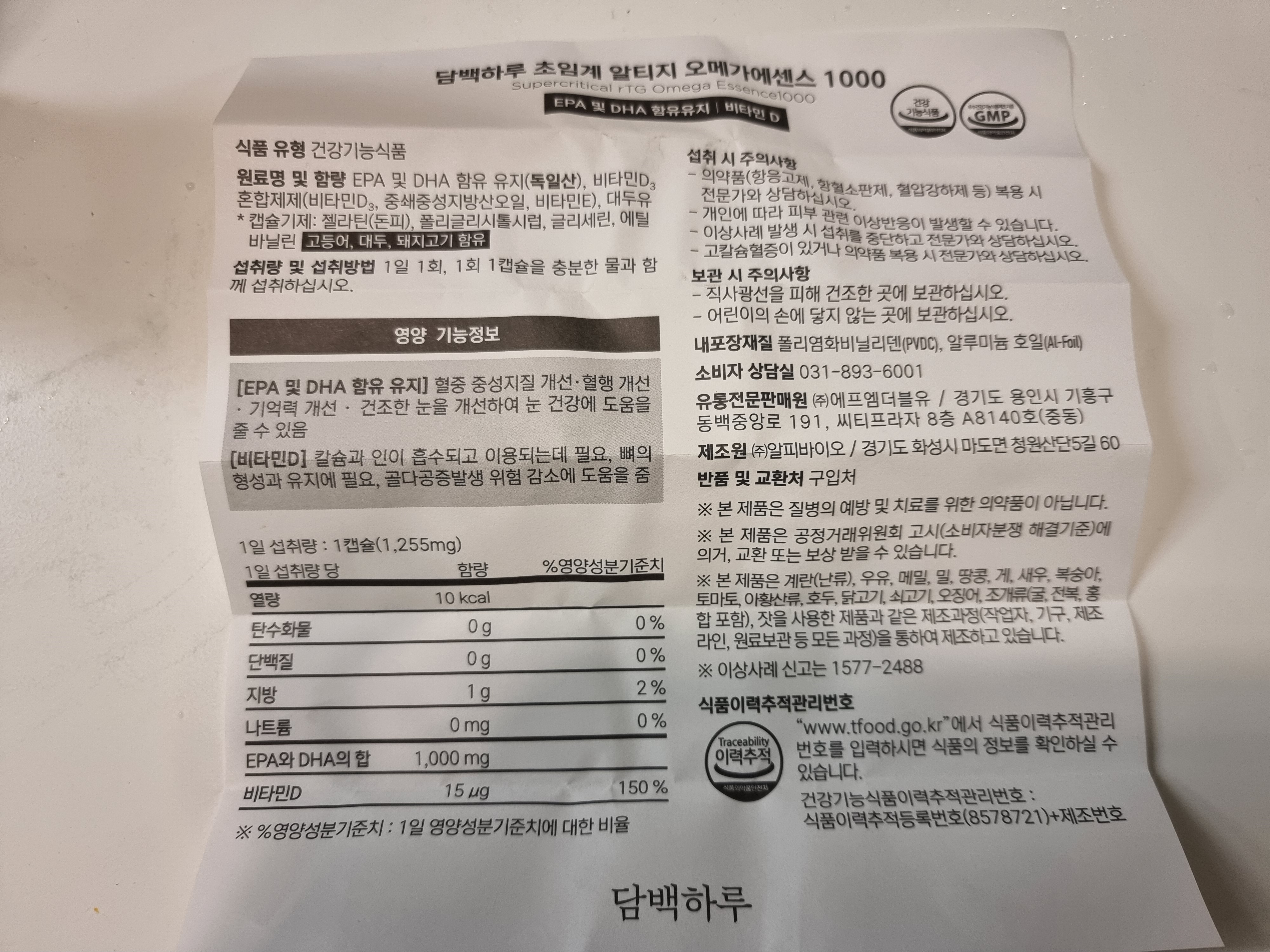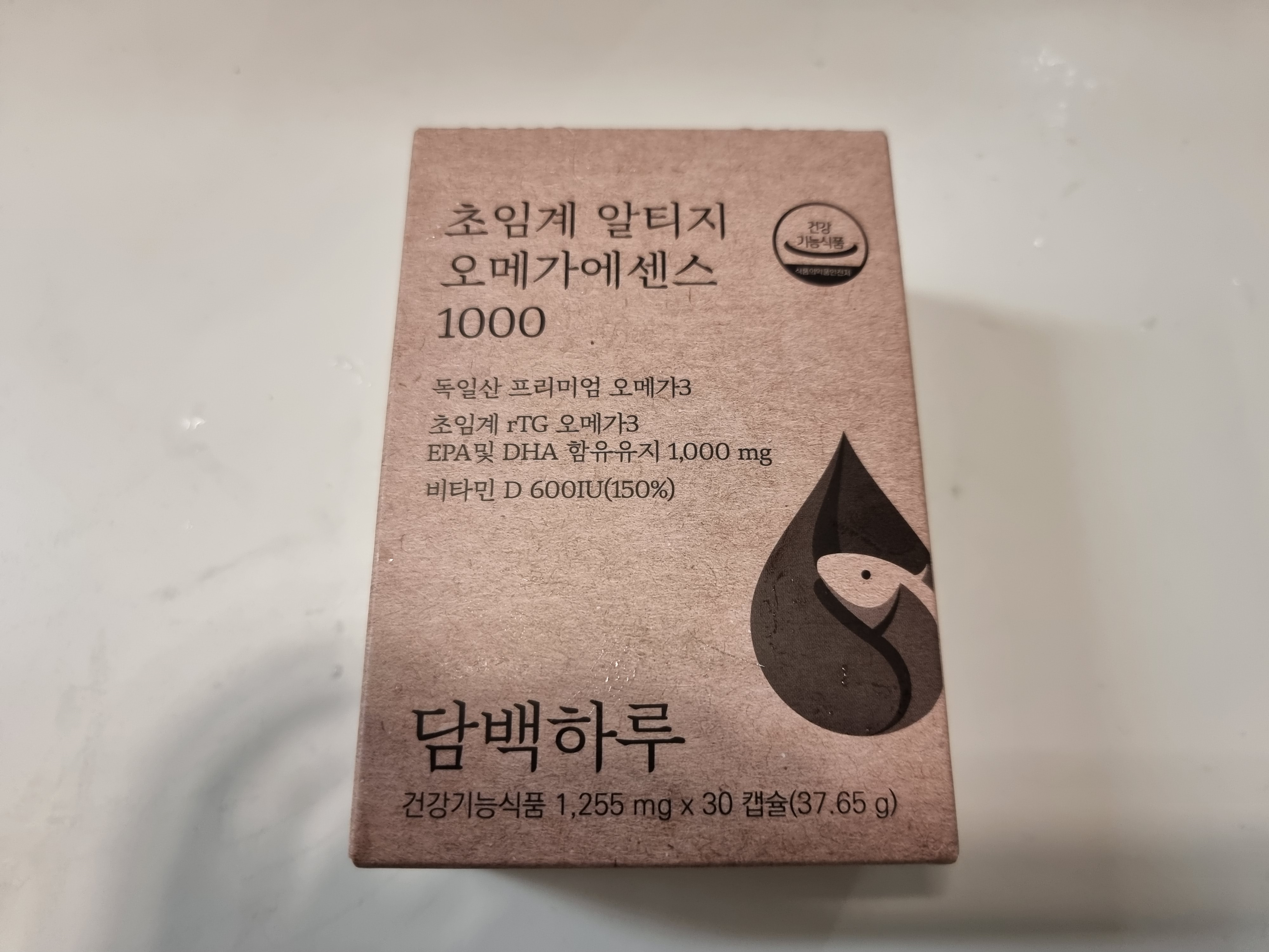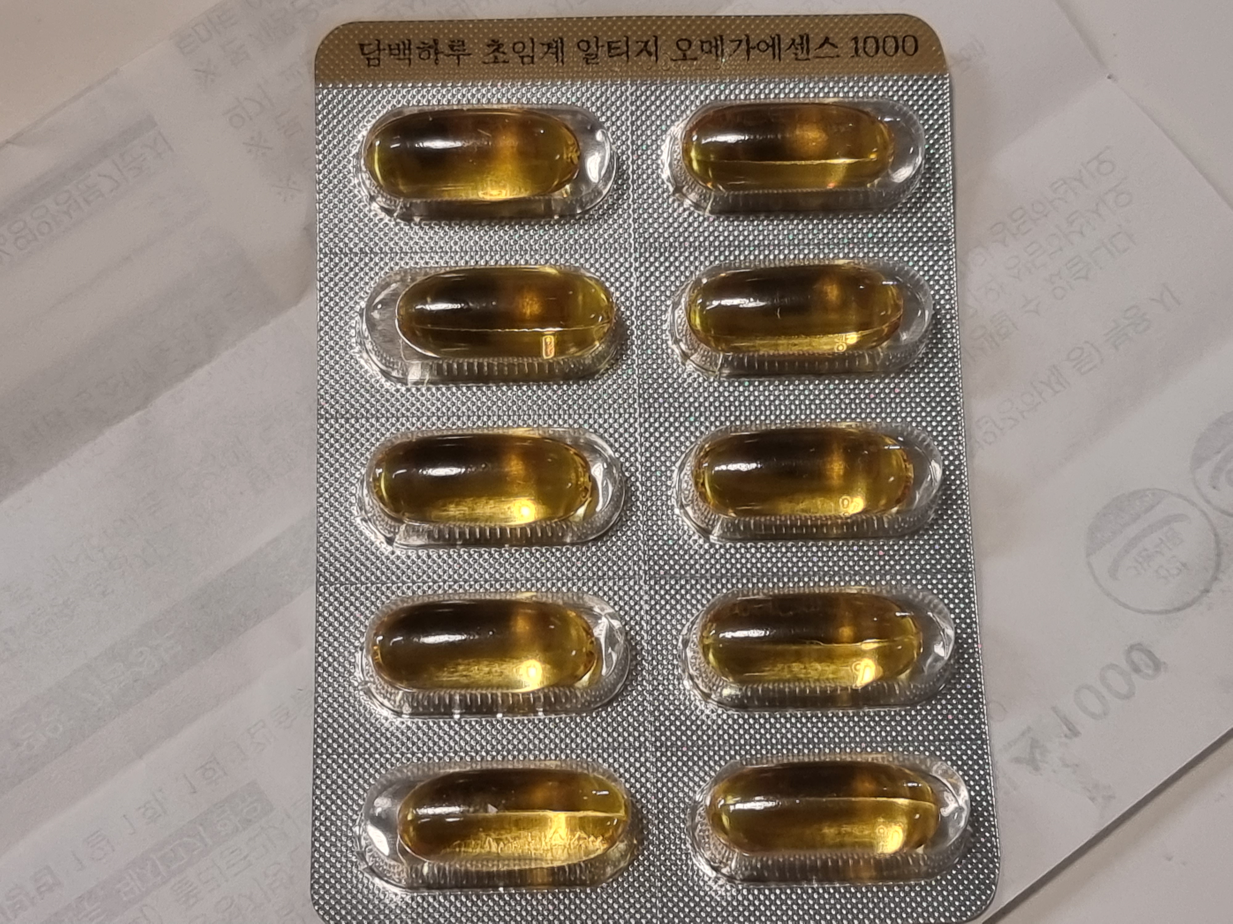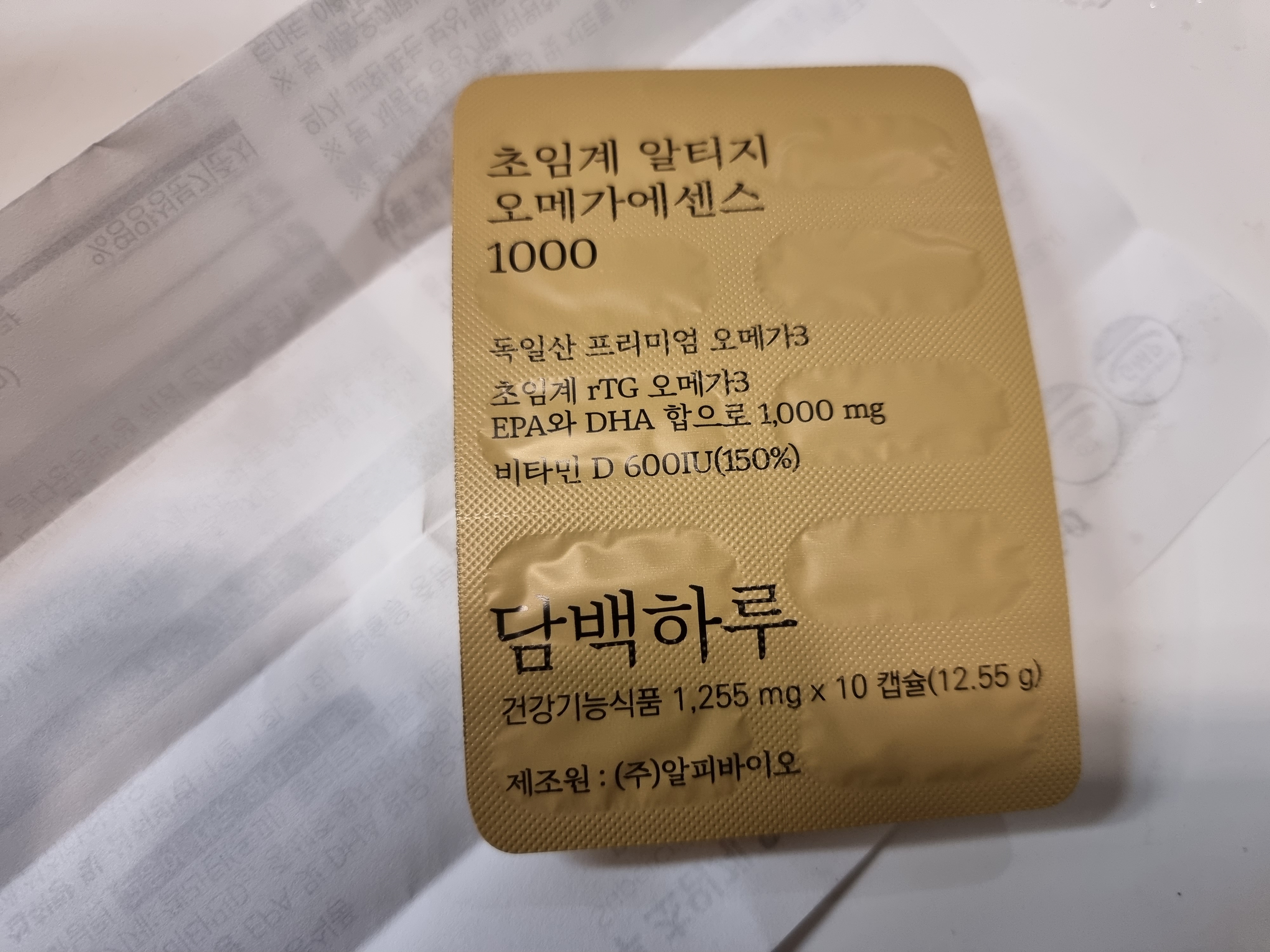 독일산 프리미엄 오메가3가 들어있고 초임게 rTG 오메가 3, EPA 및 DHA 함유유지 1000mg 이라고 한다. 비타민 D도 함께 들어있다.