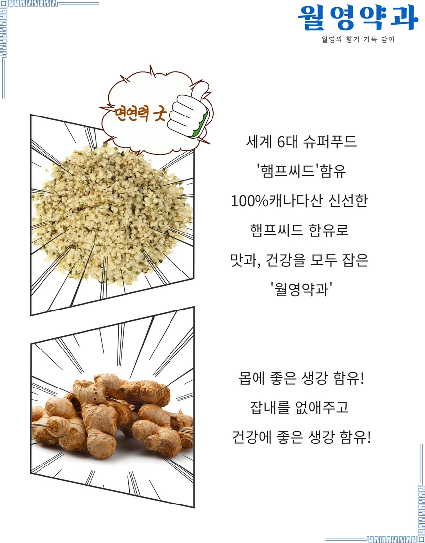 월영약과는 우리밀을 사용하며 안동마를 함유하여 건강한 먹거리를 지향하고 있습니다. 더불어 햄프씨드를 함유하였고 우리 몸에 좋은 생강까지 함유했다고 합니다.