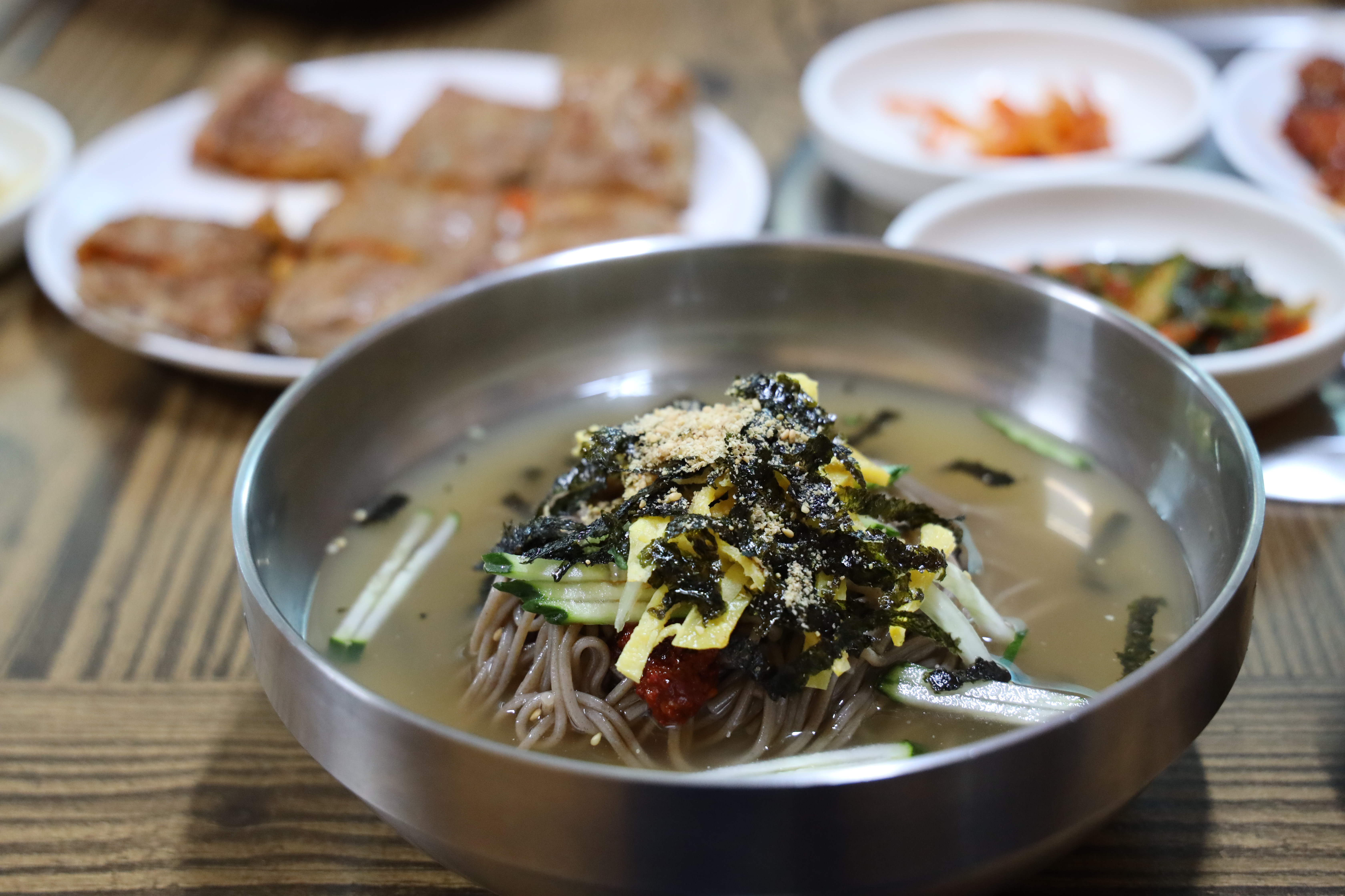 메밀막국수입니다. 국물이 시원하며 갈증을 해소시켜줍니다. 양도 푸짐해서 남자 기준으로도 양이 많은편이에요.