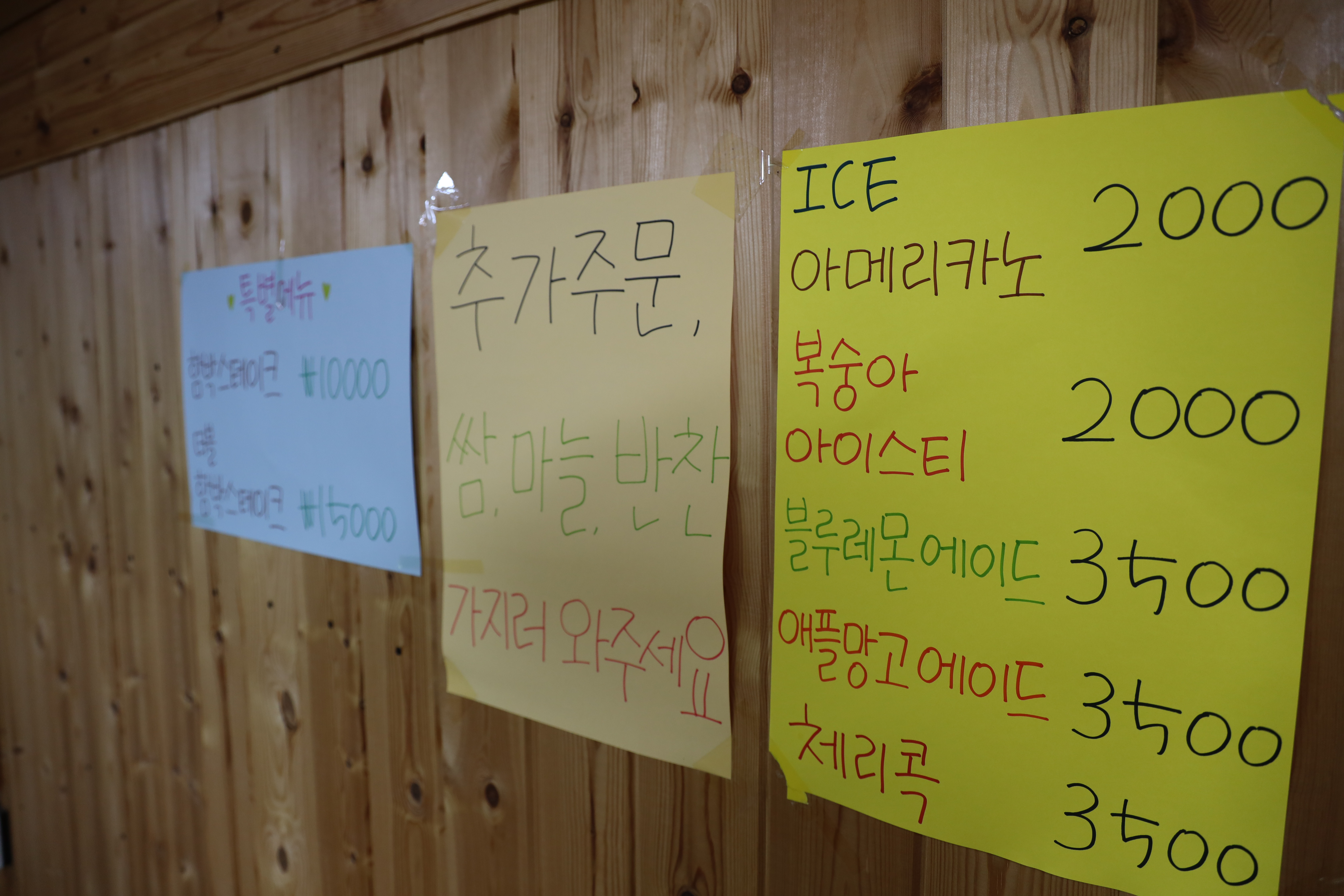 메뉴판입니다. 묵밥을 비롯해 여러가지 메뉴들이 있습니다. 식사때 사장님께 여쭤보니 곧 가격이 변경된다고하니 메뉴판은 참고 정도로만 봐주세요.