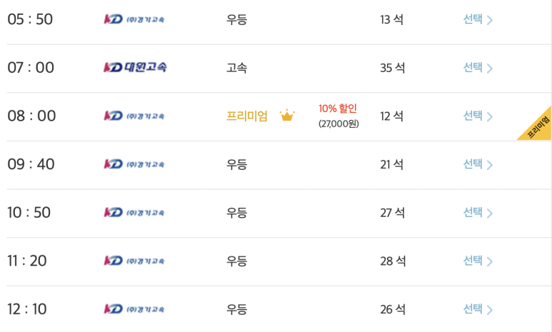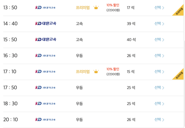 최근에 고속버스에는 프리미엄 버스가 나와있는데 할인율이 없다면 가격은 3만원 정도한다. 10% 할인을 받으면 27,000원 정도이다.
